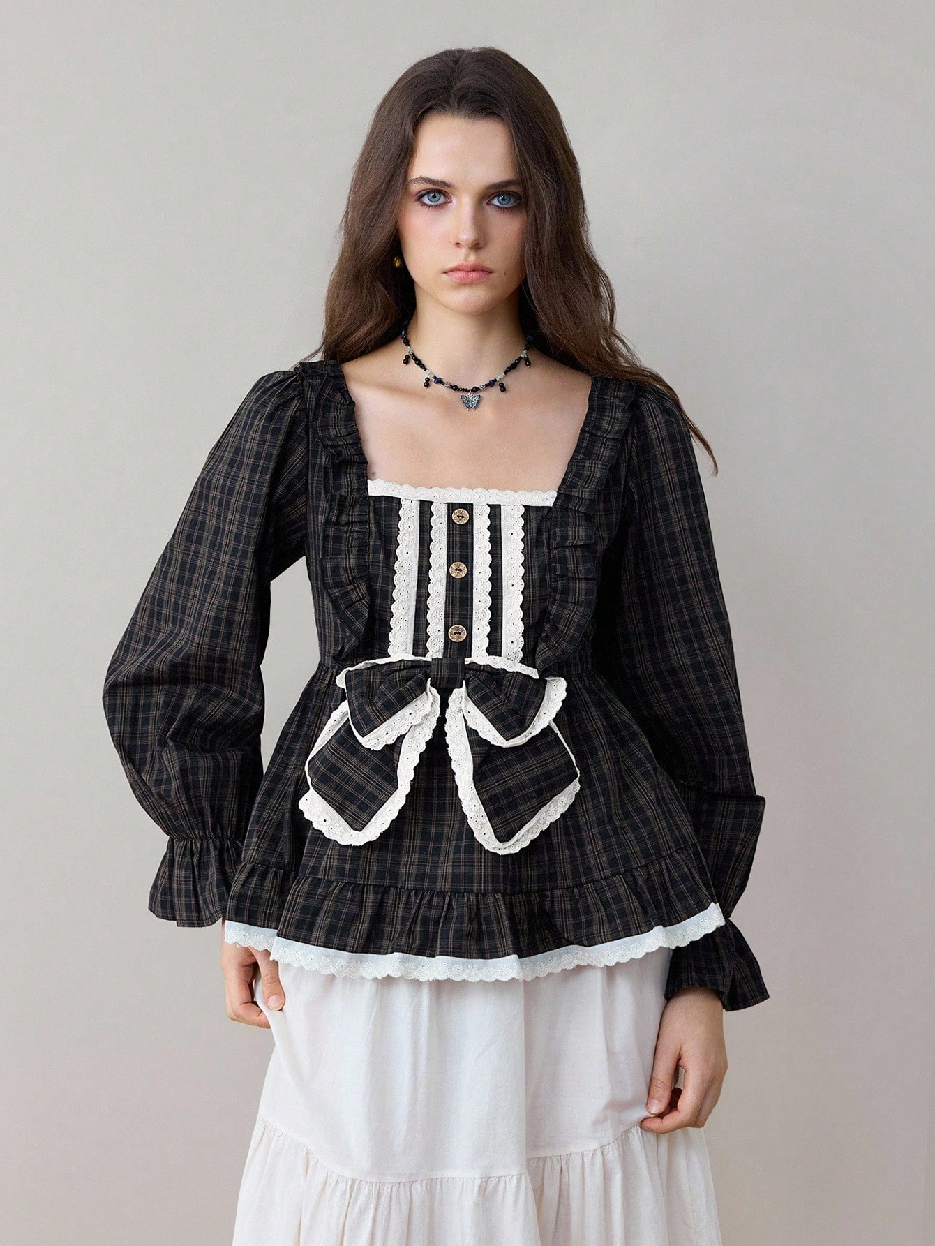 ROMWE Avant Women's Mori Kei Vintage Cottagecore Mori Style Plaid Fabric Square Collar Lace Patchwork Bow Puff Sleeve Doll Dress Long Sleeve Blouse