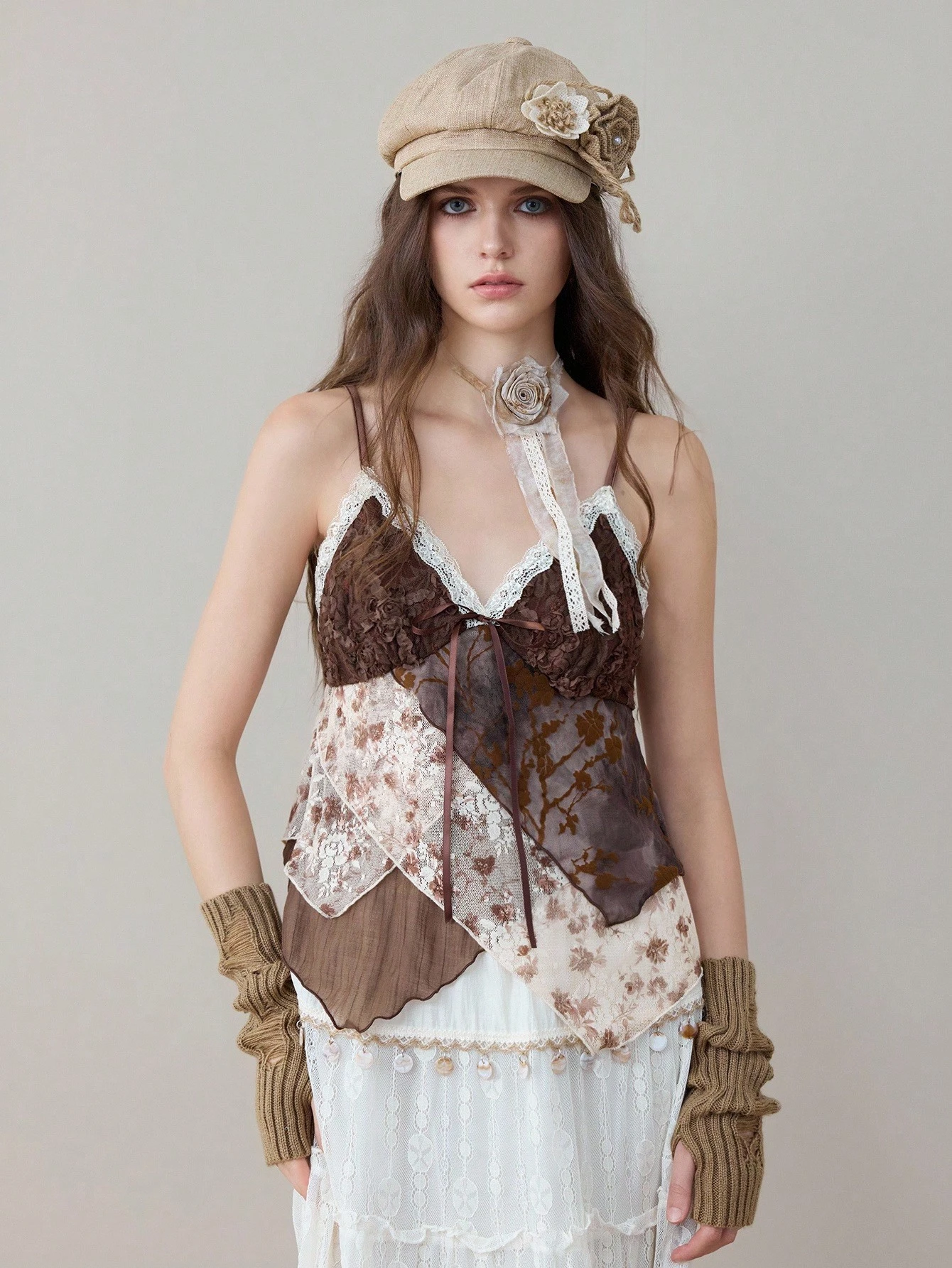 ROMWE Avant Women's Mori Kei Vintage Mori Style Cottagecore Fabric Patchwork Layered Lace Trim Textured Fabric Pinafore Camisole Camisole