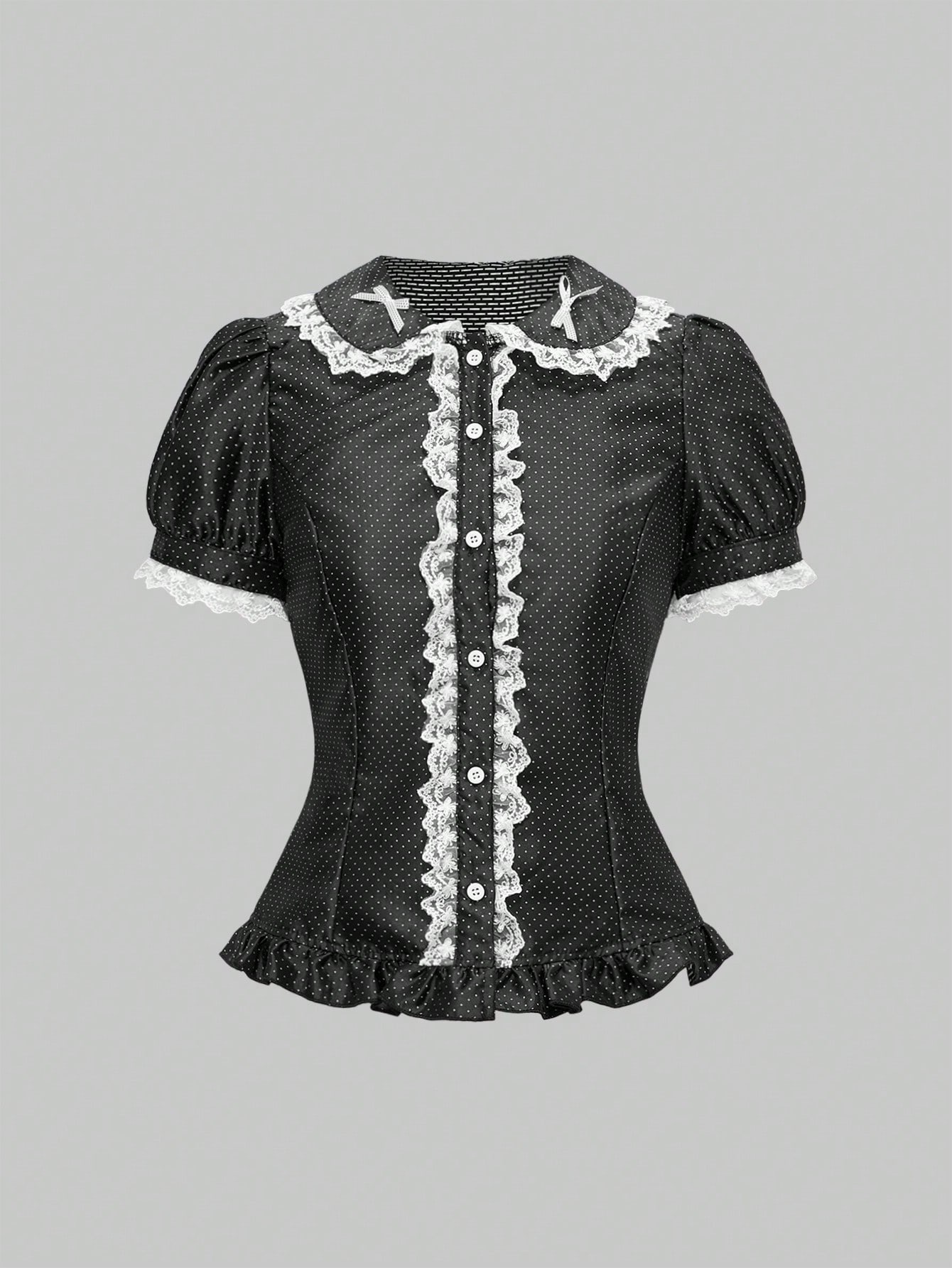 Kawaii Women's Polka Dot Fitted Waist Lace Patchwork Short Sleeve Blouse