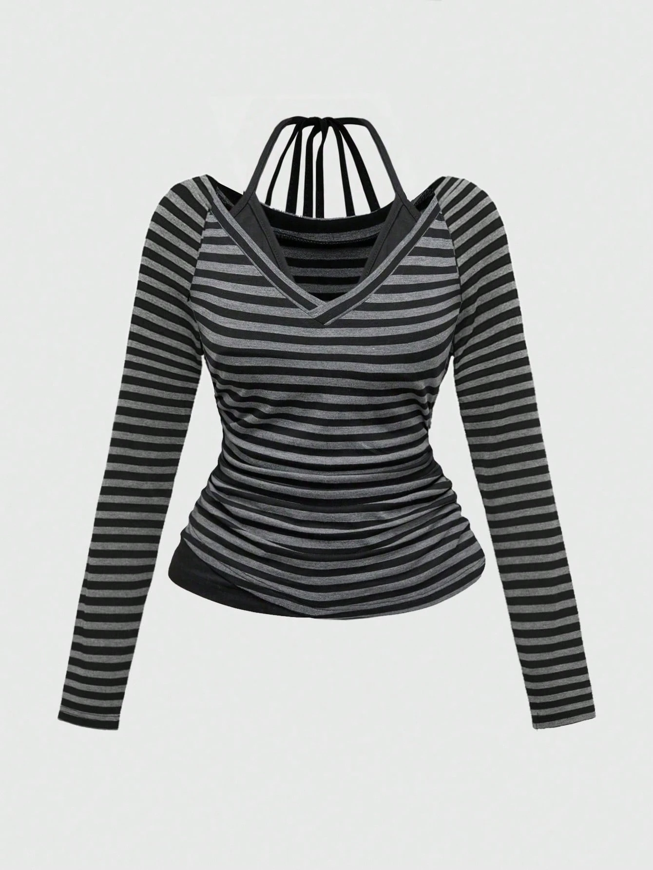 Grunge Punk Women's Sexy Y2K 2 In 1 V-Neck Striped Contrast Color Halter Tie Bow Long Sleeve T-Shirt, Autumn