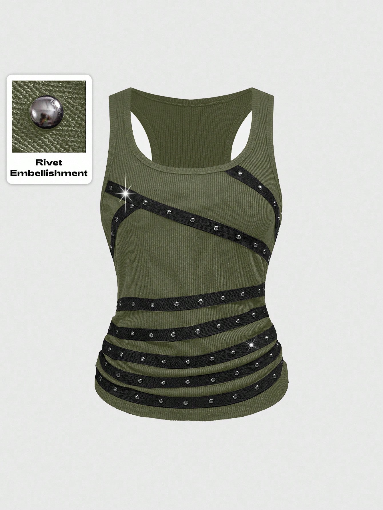 Grunge Punk Women's Sleeveless Backless Sexy Vest, Black, Studded, Rhinestone, Ribbon Decor, Suitable For Summer Beach, Graduation, Easter, Concert, Nashville Vacation, Music Festival, Rock