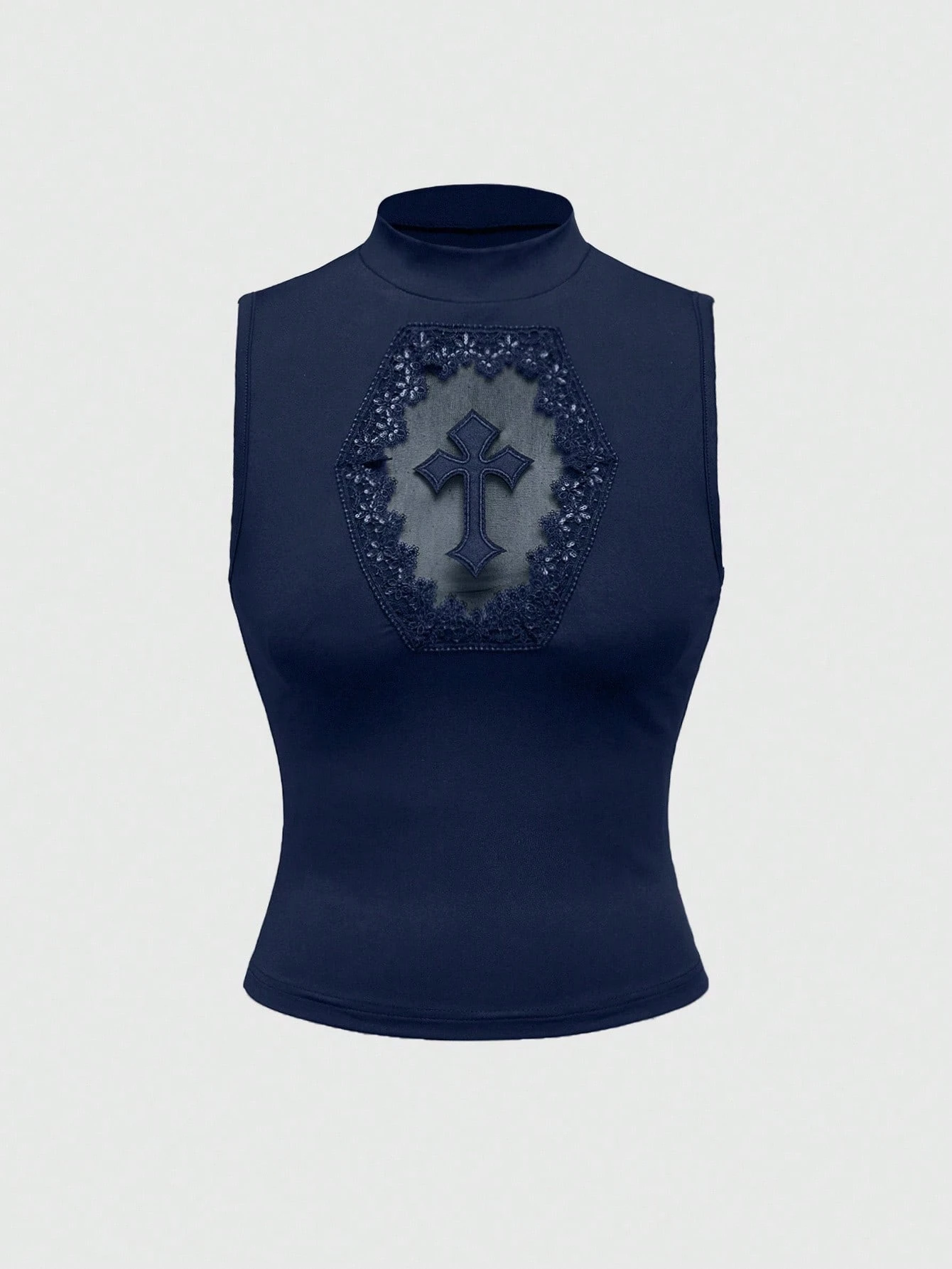 J-Fashion Women's Slim Fit Mandarin Collar Hollow Cross Embroidered Vest