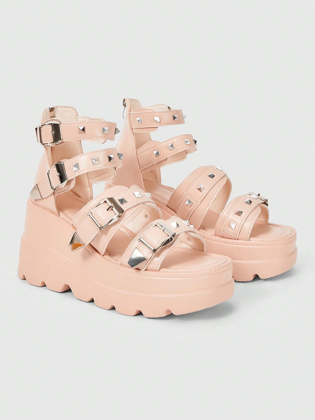 Grunge Punk Women's Stylish Metal Buckle Peep Toe Thick-Soled Flat Heels (7.5cm) Vintage PU Leather Black Sandals, Suitable For Summer Outing And Dating