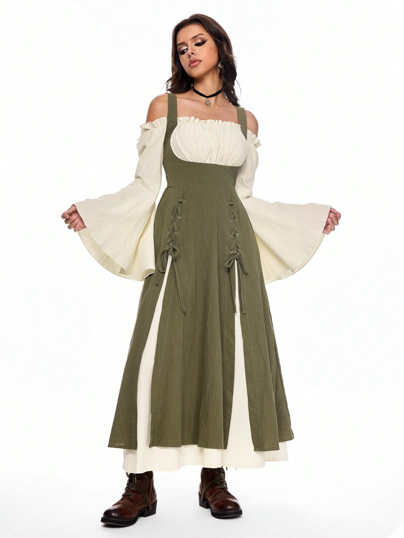 Hippie Women's Vintage Cottagecore Style Contrast Color Patchwork Off Shoulder Tie-Up Flared Sleeve Midi Dress