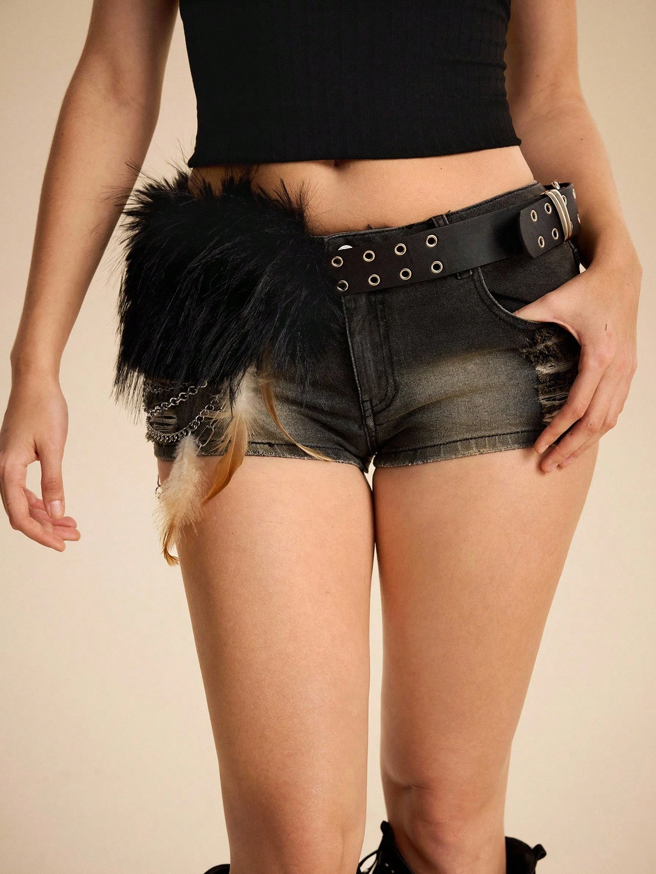 EDITION Women's Y2K Baddie Retro Sexy Hippie Music Festival Furry PU Patchwork Feather Decor Low Waist Mini Denim Shorts