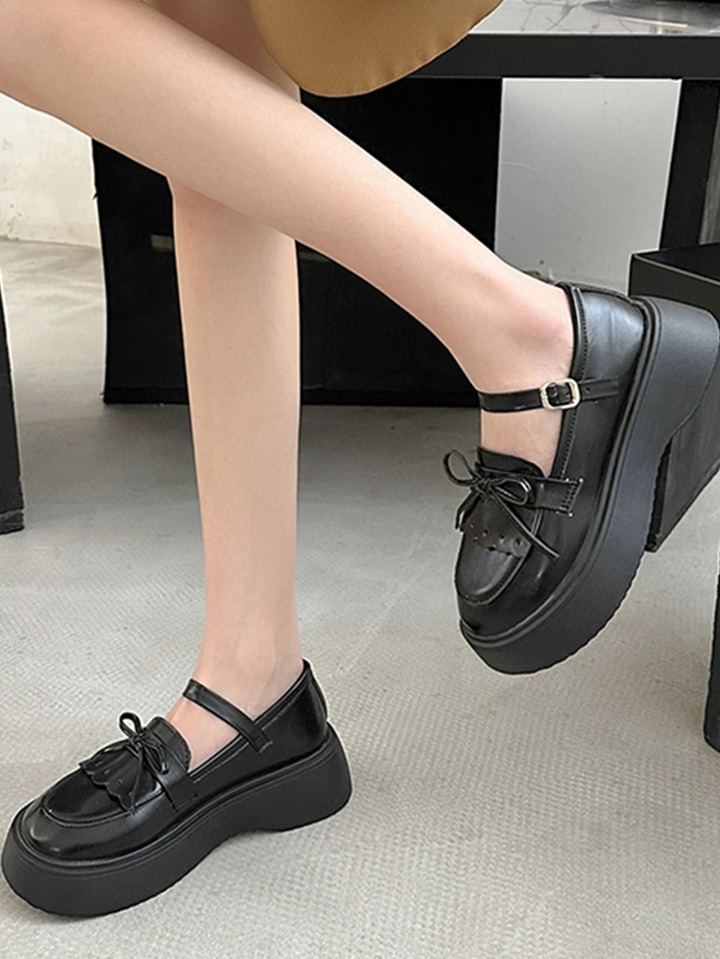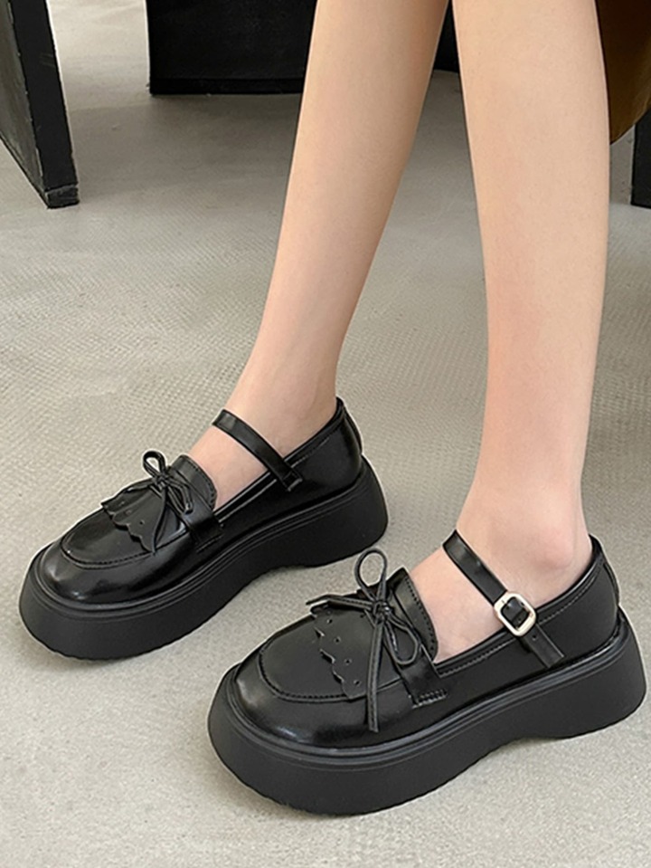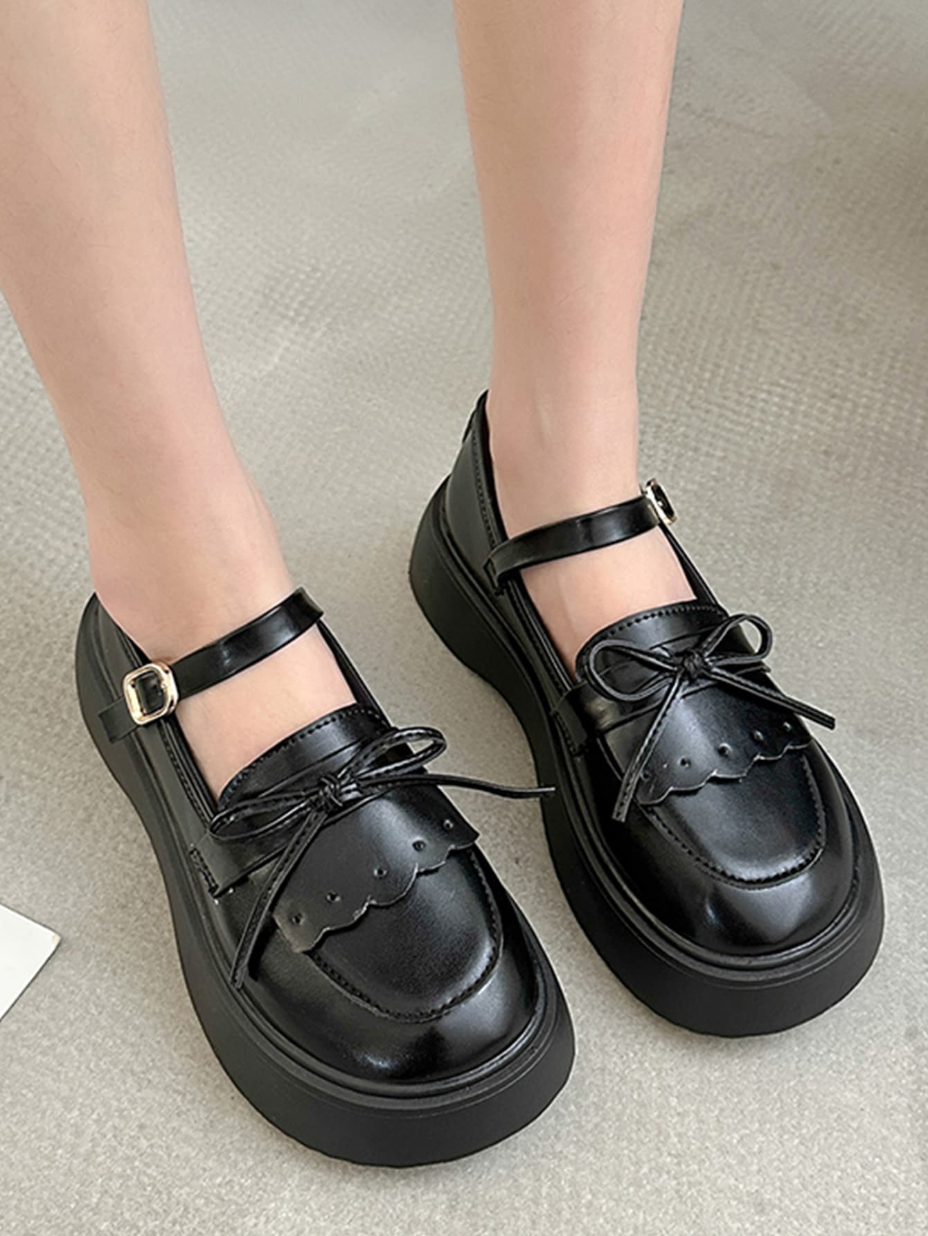 Women Bow Decor Mary Jane Shoes, Preppy Black Flatform Shoes