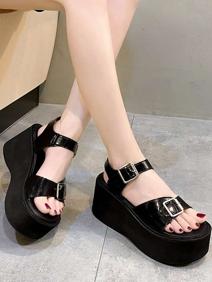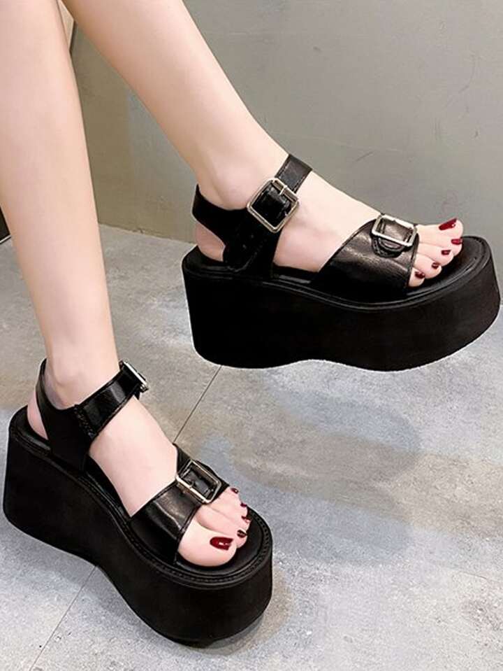 Women Buckle Decor Ankle Strap Sandals, Punk Black Wedge Sandals