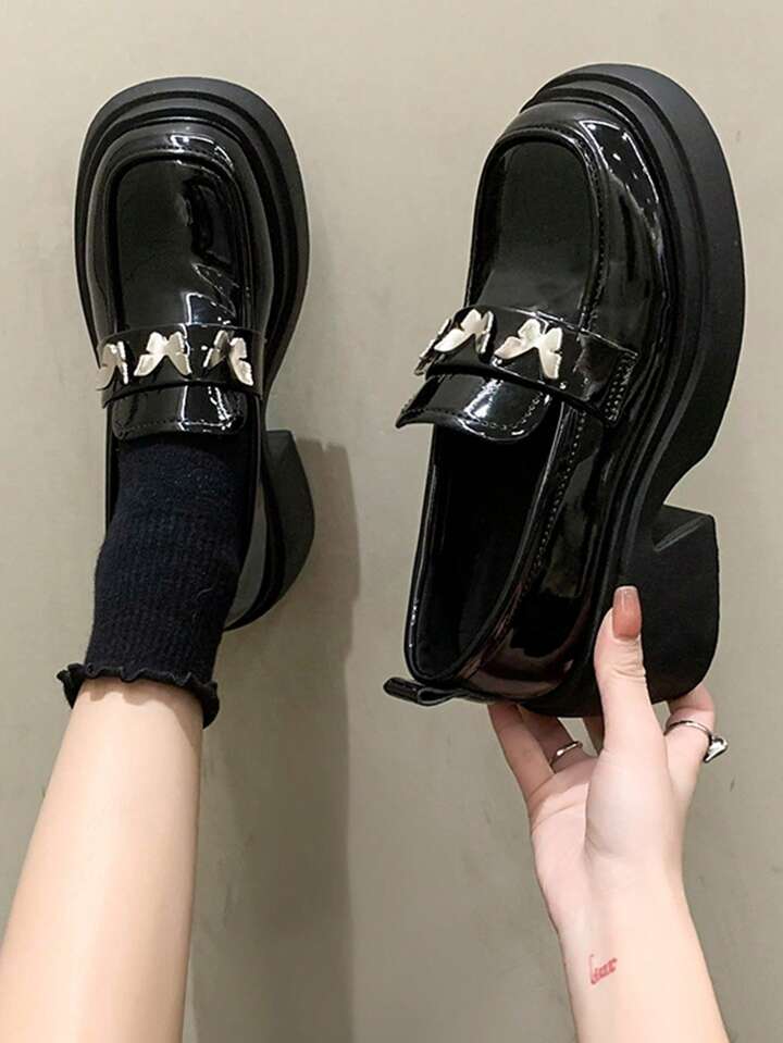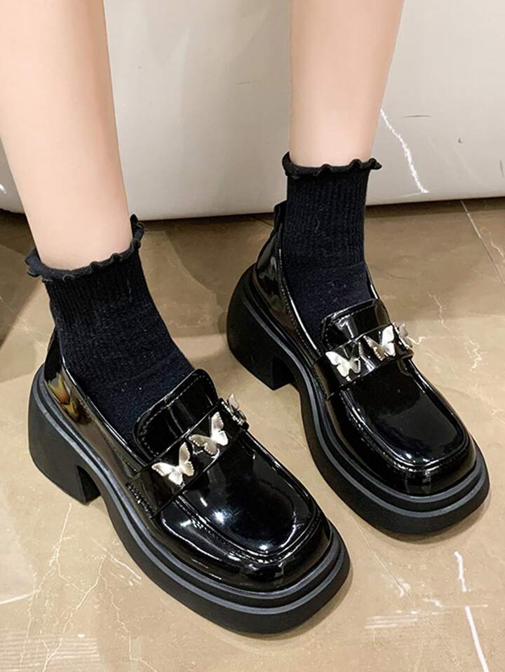 Women Butterfly Decor Flatform Shoes, Preppy Black Loafer Shoes