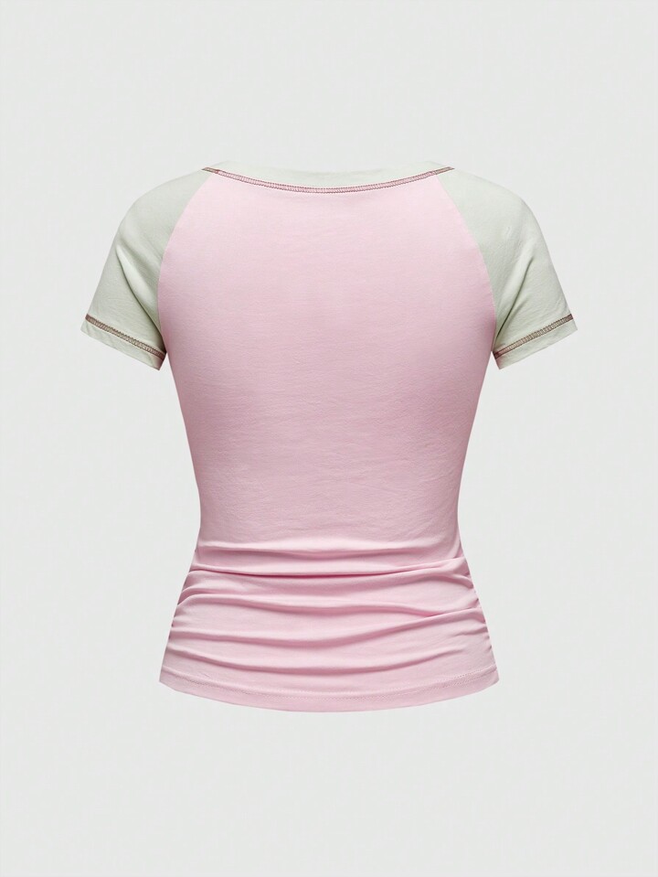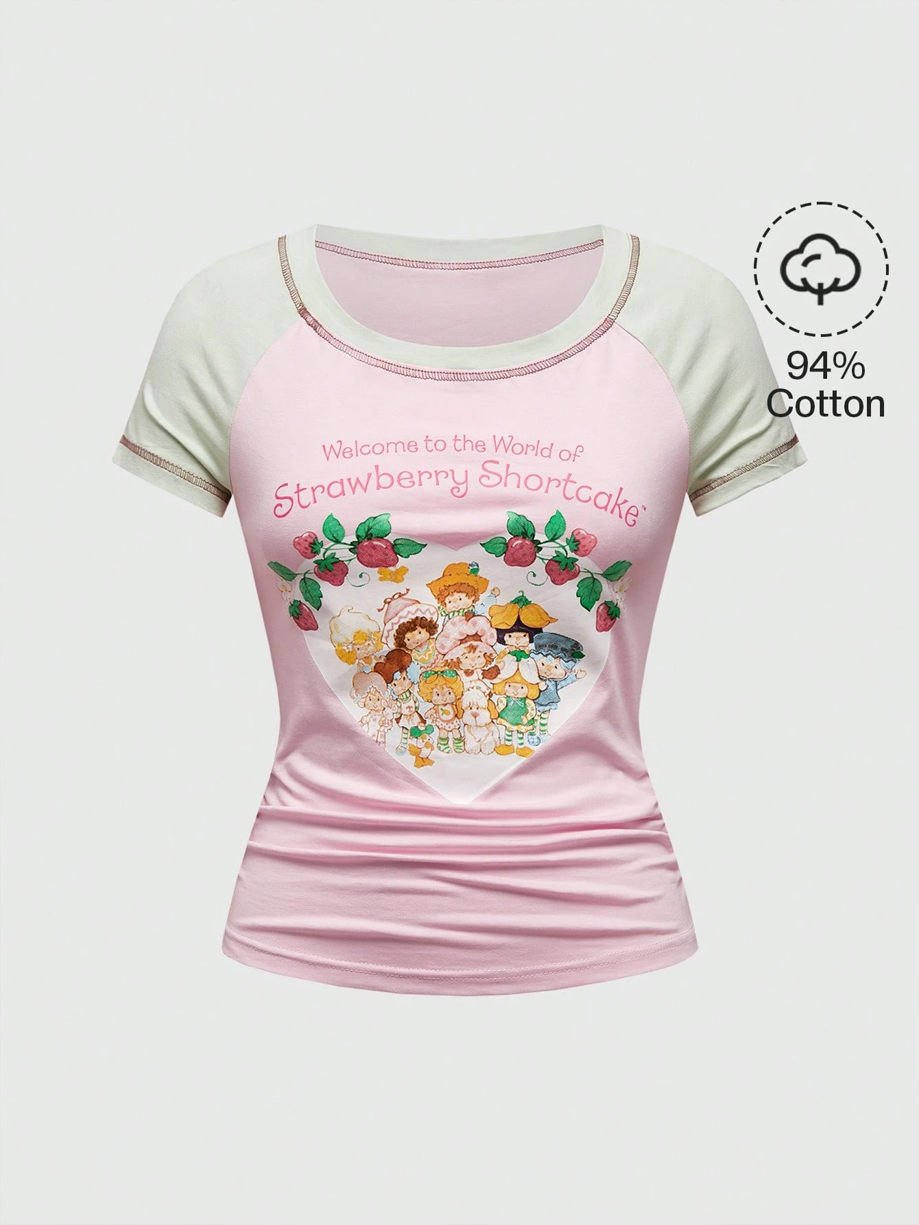 Women Casual Cute Cartoon Character & Slogan Print Raglan Sleeve Contrast Stitch Fitted T-Shirt, For Summer