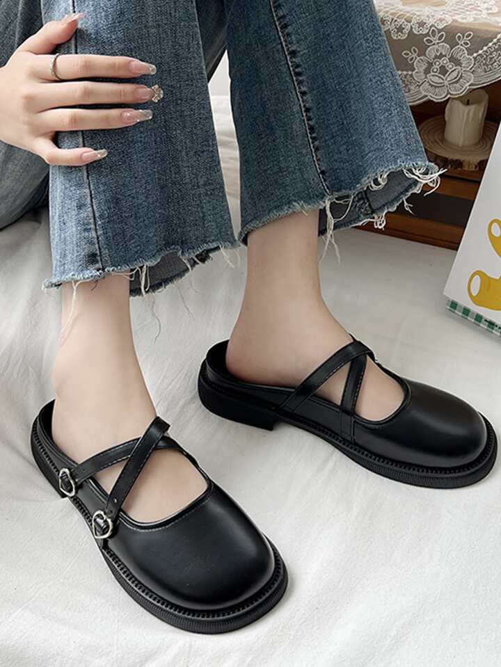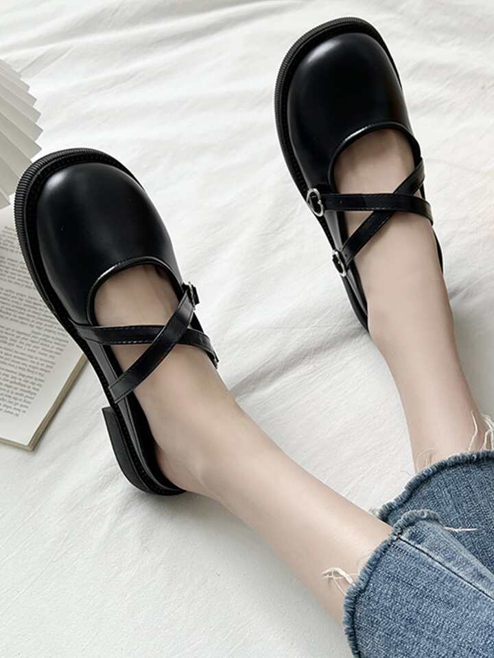 Women Criss Cross Buckle Decor Mary Jane Flats, Preppy Black Flat Shoes