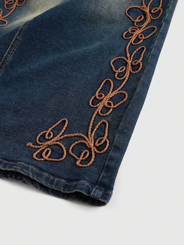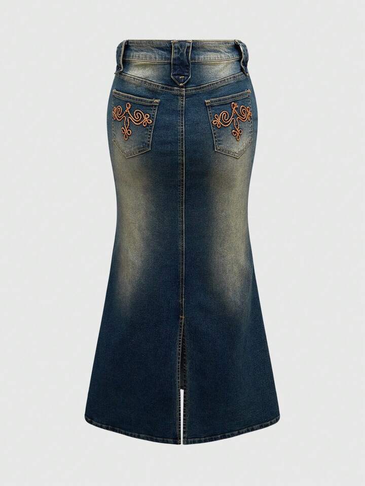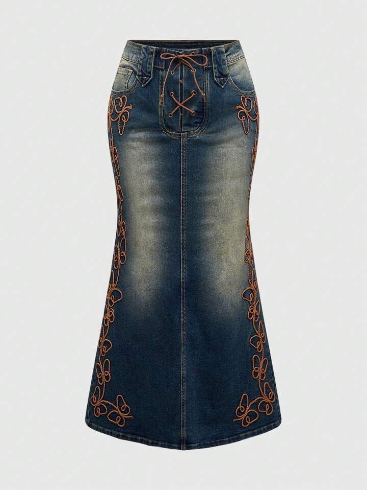Women Fairycore Drawstring Embroidered Denim Long Skirt