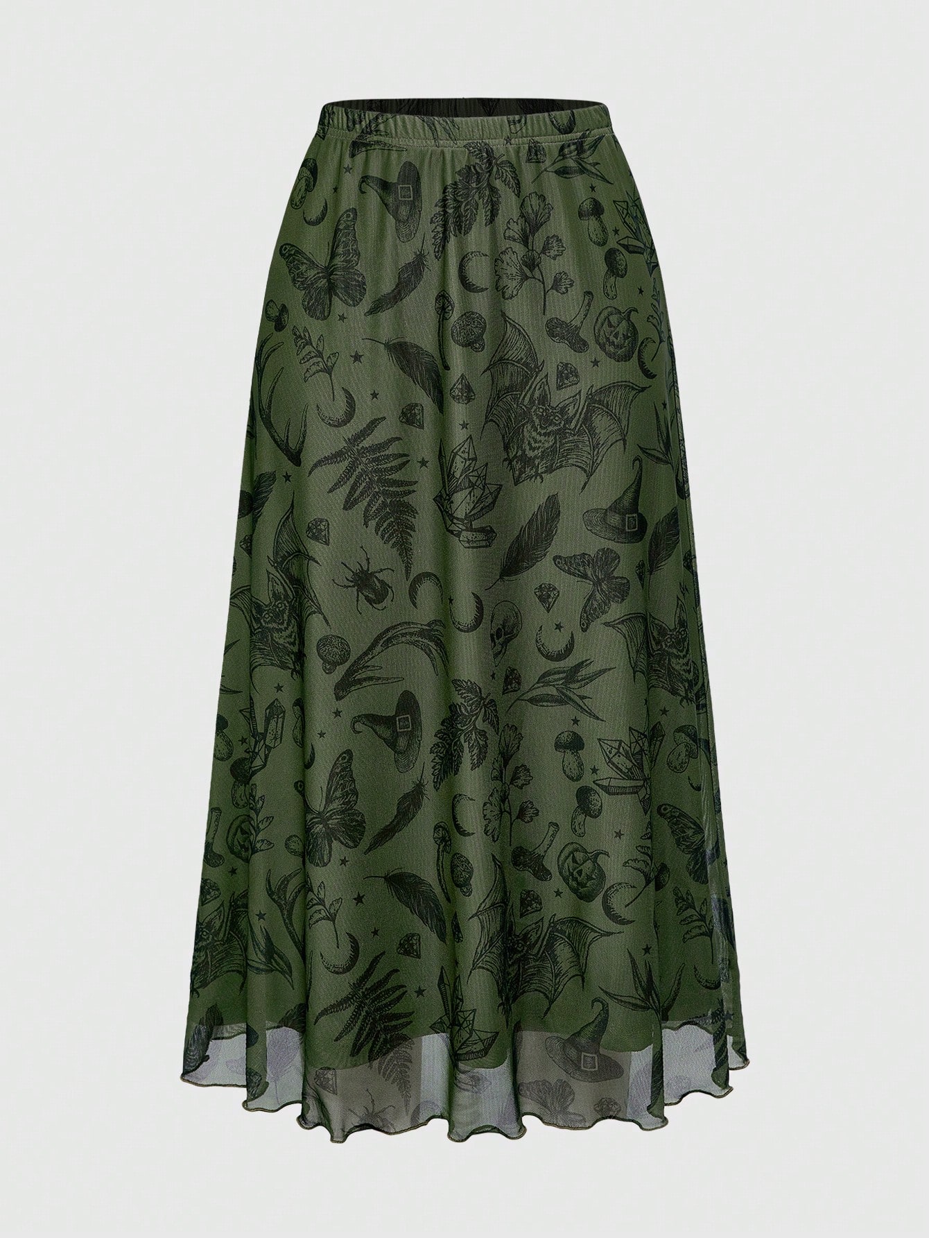 Fairycore Women Goth Style Bat Skull Moon Pumpkin Print A-Line Punk Mini Skirt