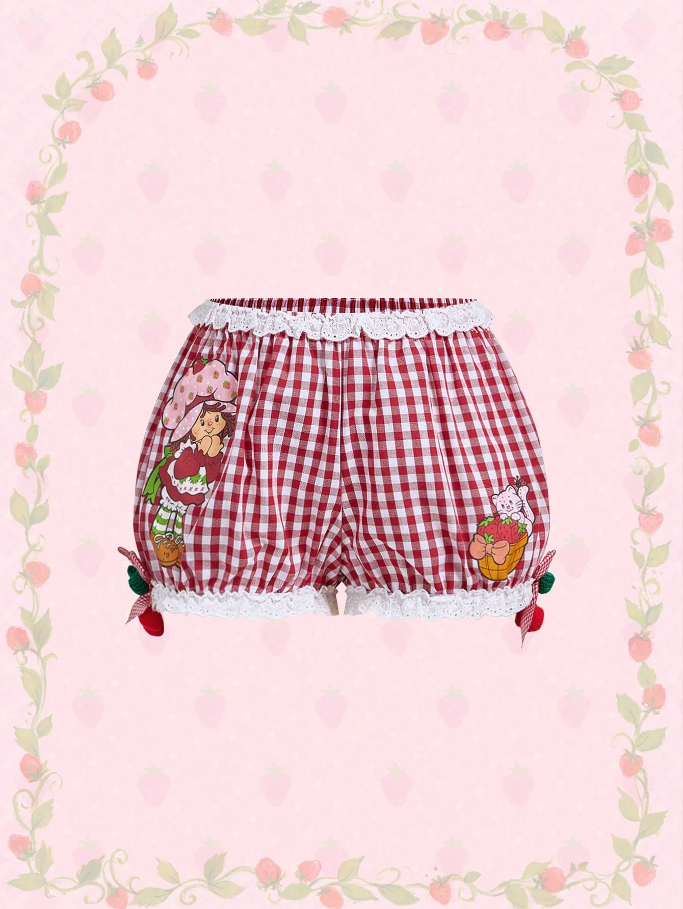Women Plaid Cute Strawberry Girl Pattern Puffball Shorts