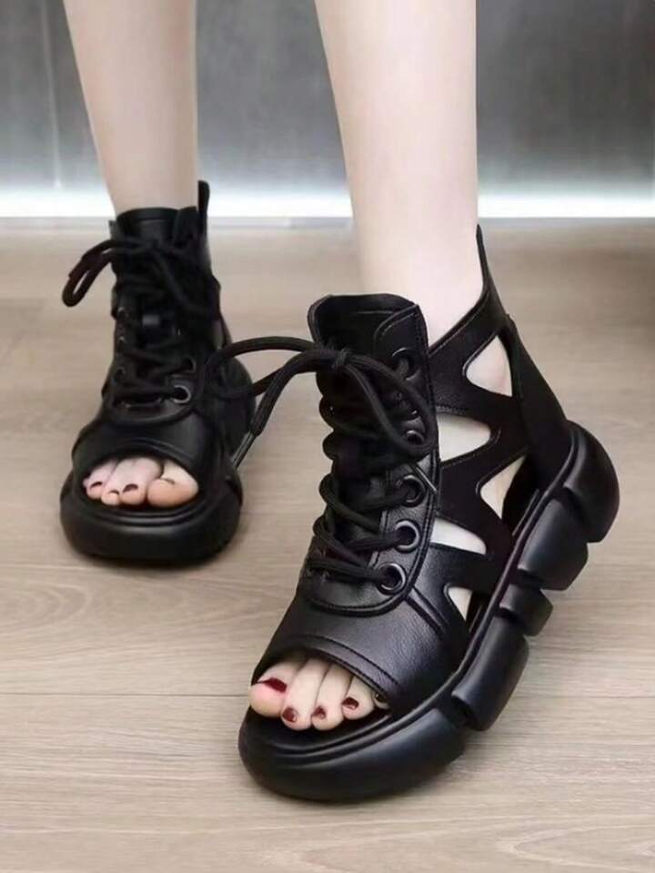 Women Solid Lace-up Front Open Toe Flatform Sandals, Cool Outdoor Sandals