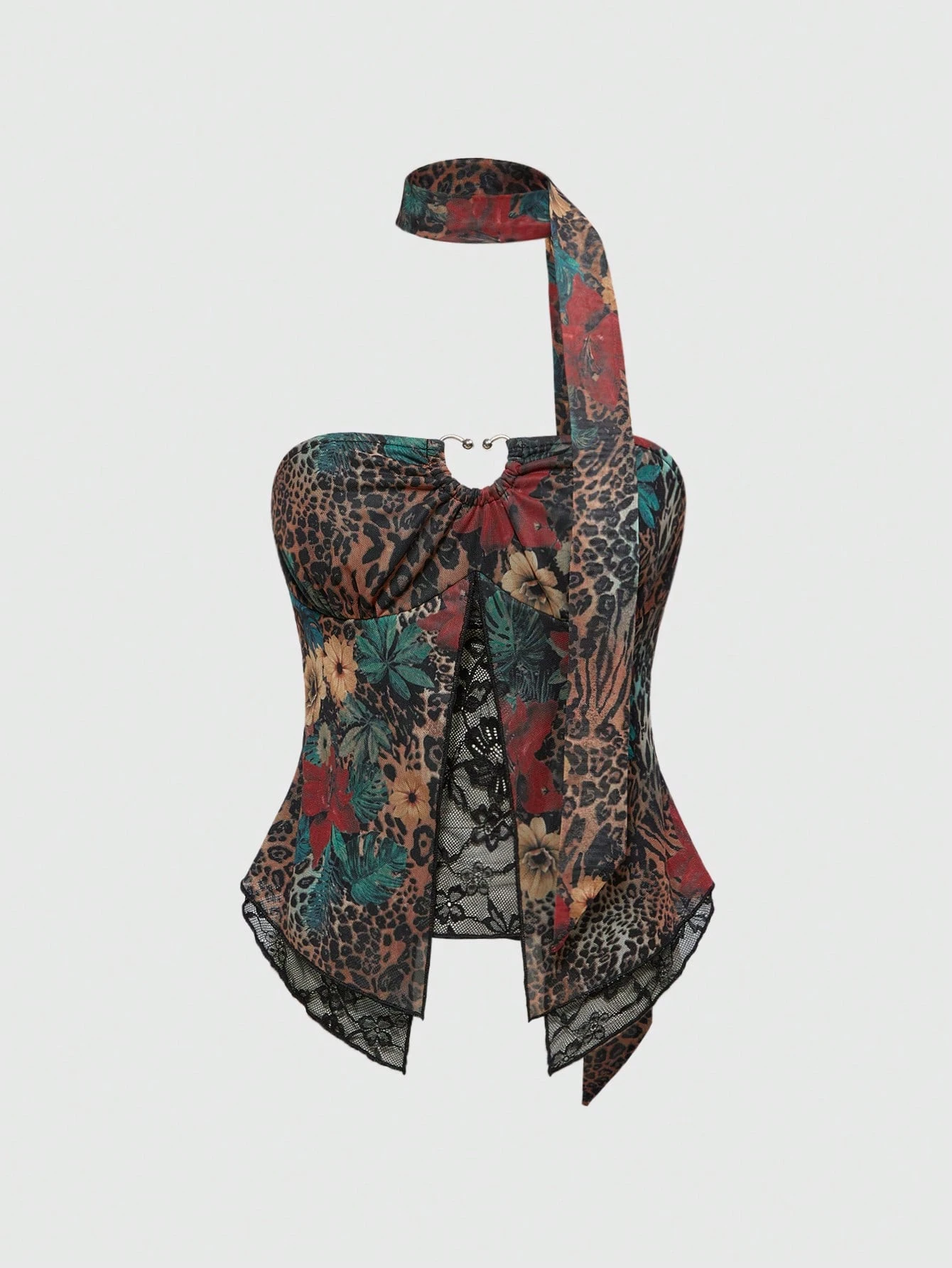 Hippie Women Vintage Leopard & Floral Print Patchwork Lace Trim Asymmetric Hem Camisole Top