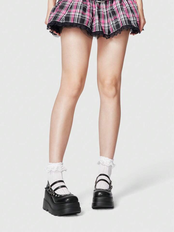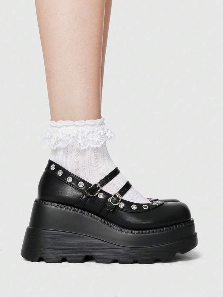 Women's Black Multi-Pocket Punk Gothic Mary Jane Shoes, JK Style Leather Platform Loafers