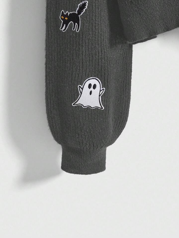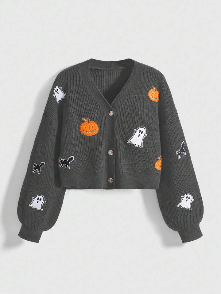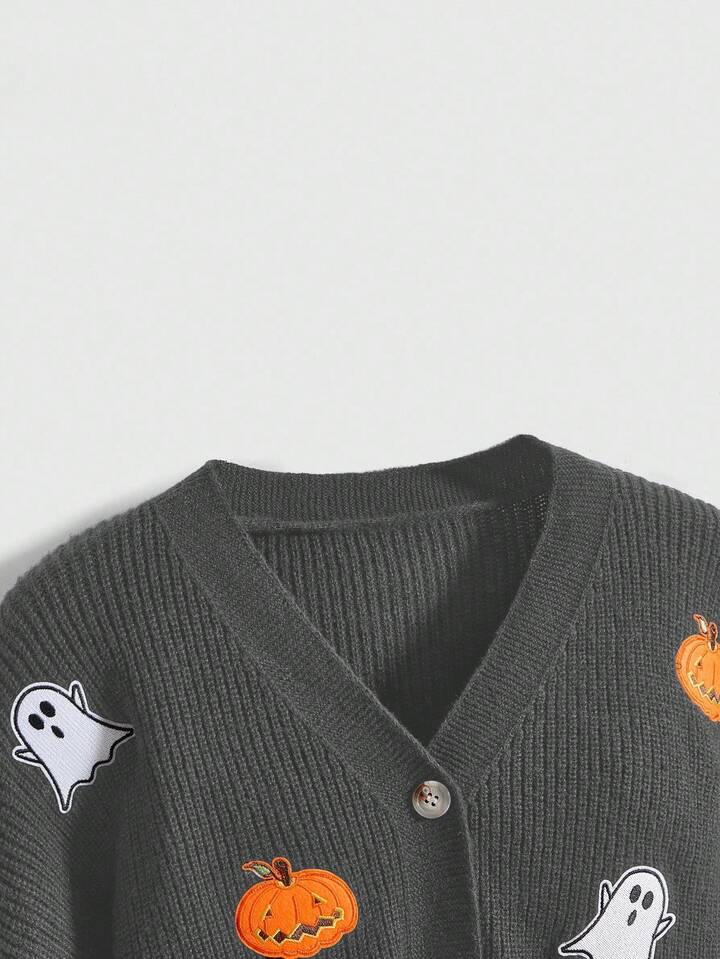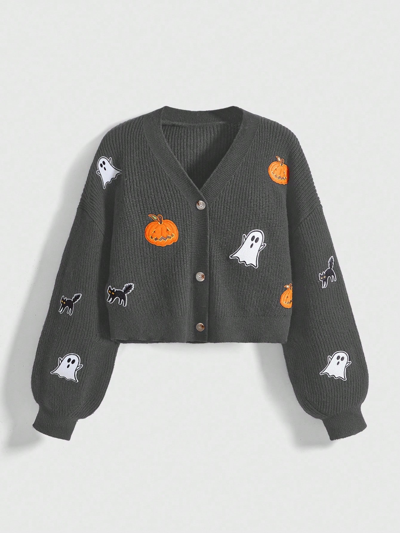 Women's Cartoon Halloween Applique V-Neck Button Front Long Sleeve Knit Cardigan