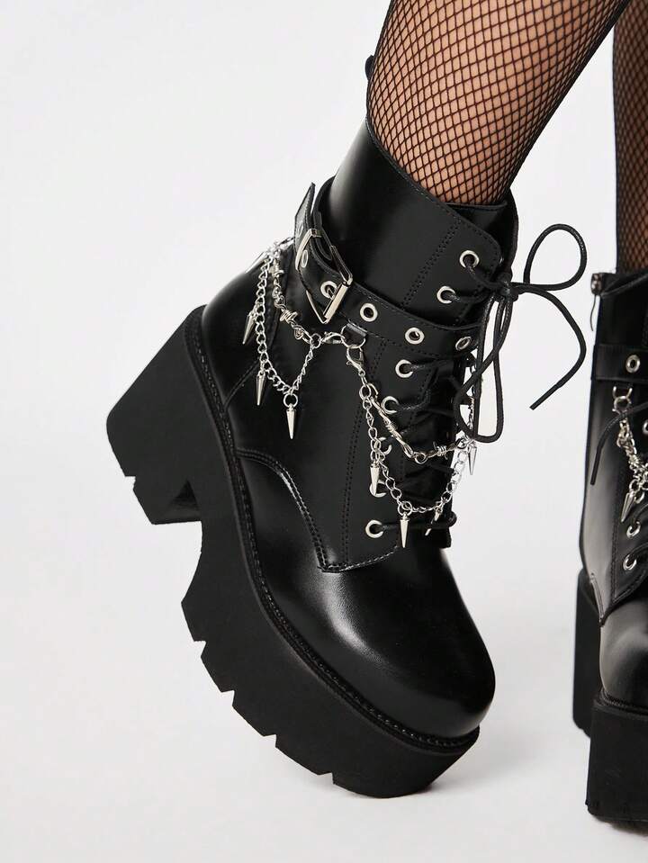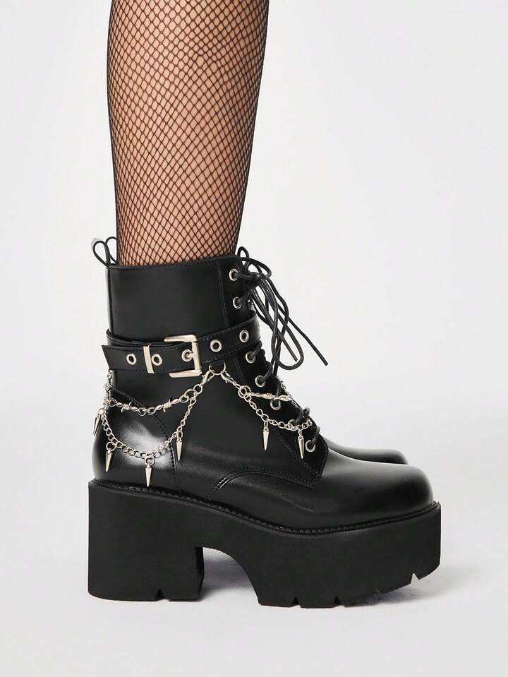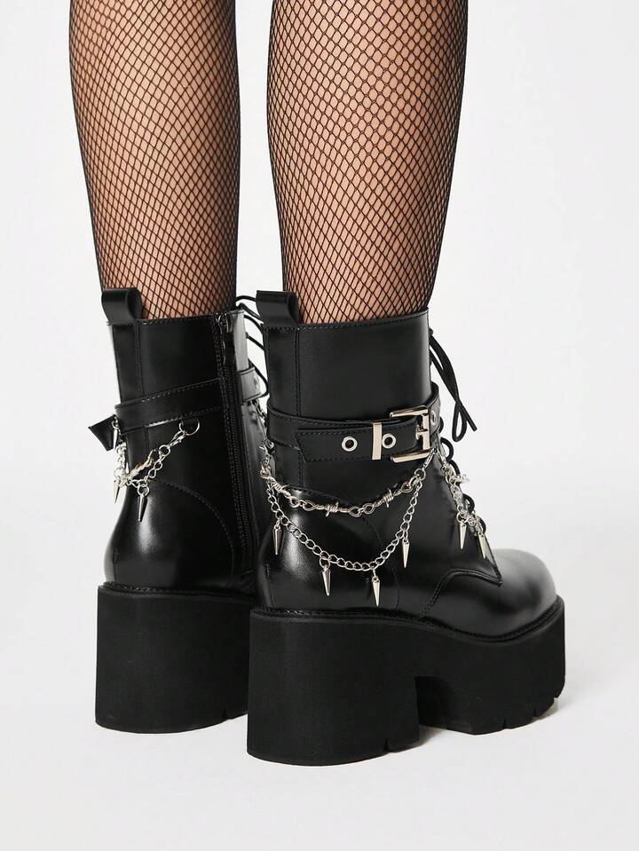 Women's Dark Punk Style Platform Chunky Heel Ankle Boots, Gothic Y2K Metal Stud Pendant Thorn Chain Decorative Buckle Strap, Nightclub Party And Festival Wedge Heel Lace-Up Side Zipper Ankle Boots, Comfortable Combat Boots, Halloween