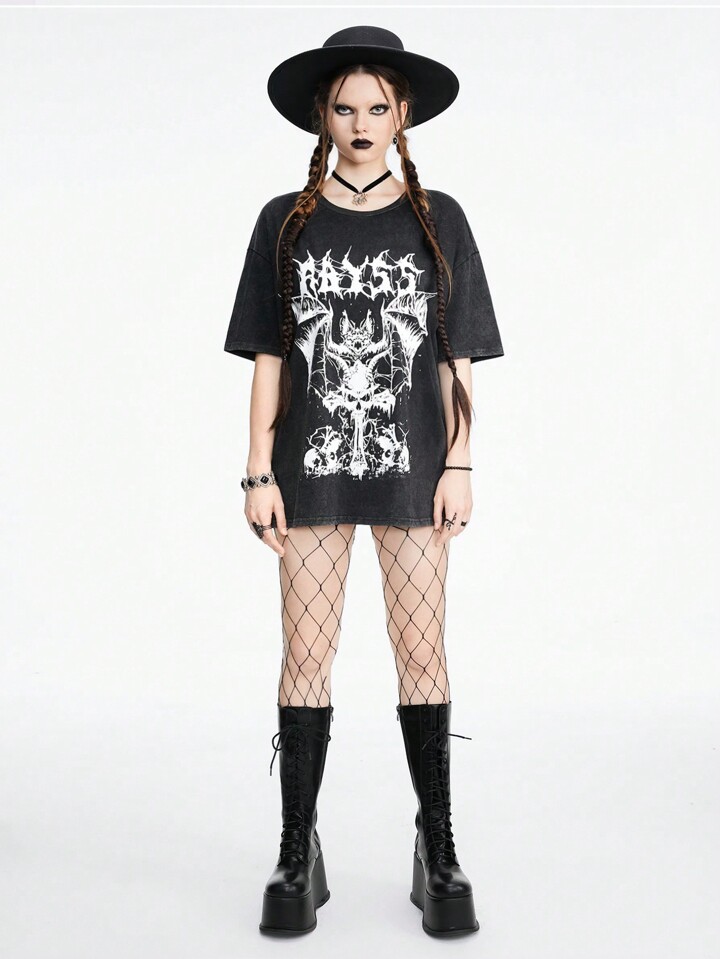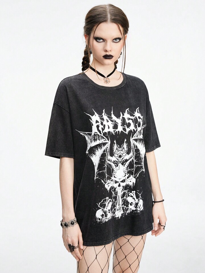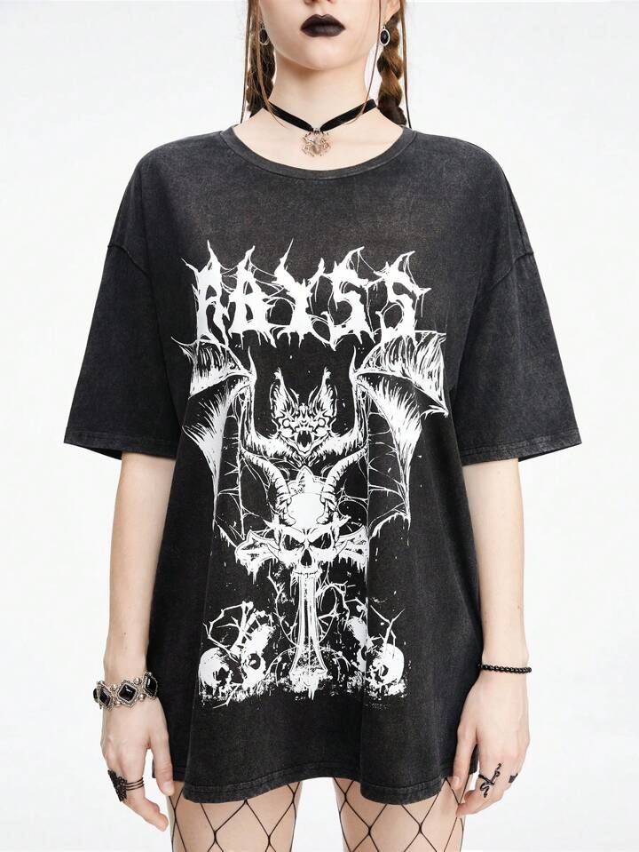 Women's Gothic Bat And Cross Printed Distressed T-Shirt For Summer