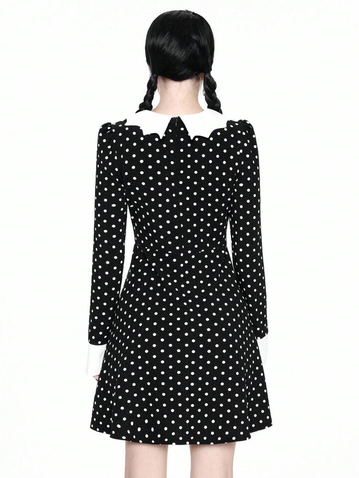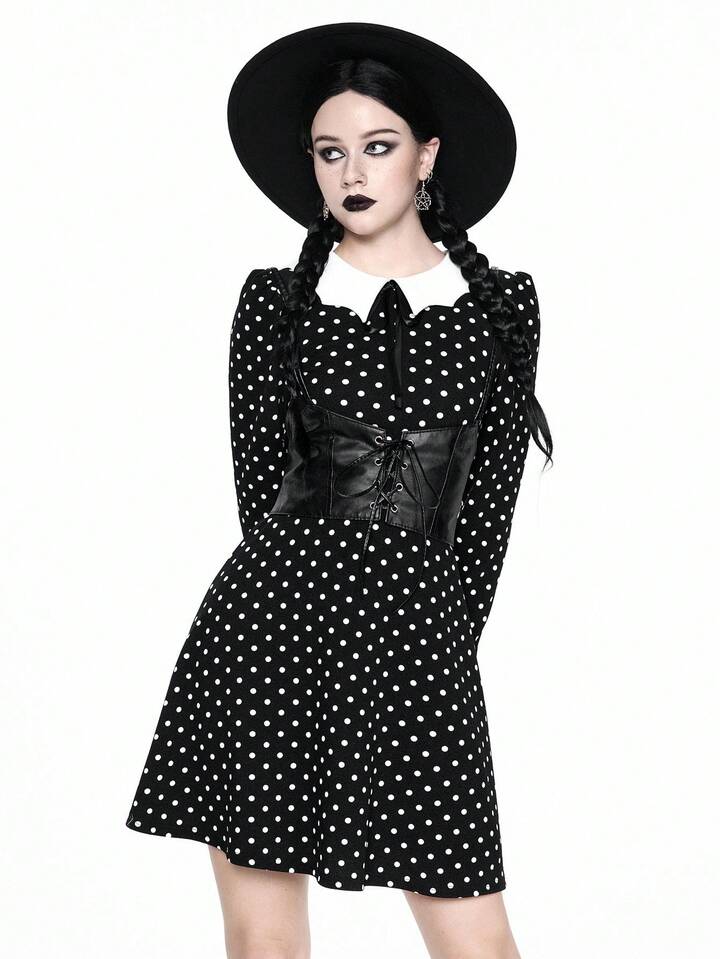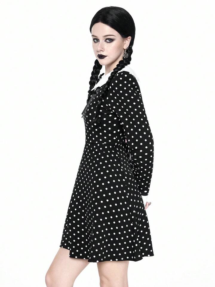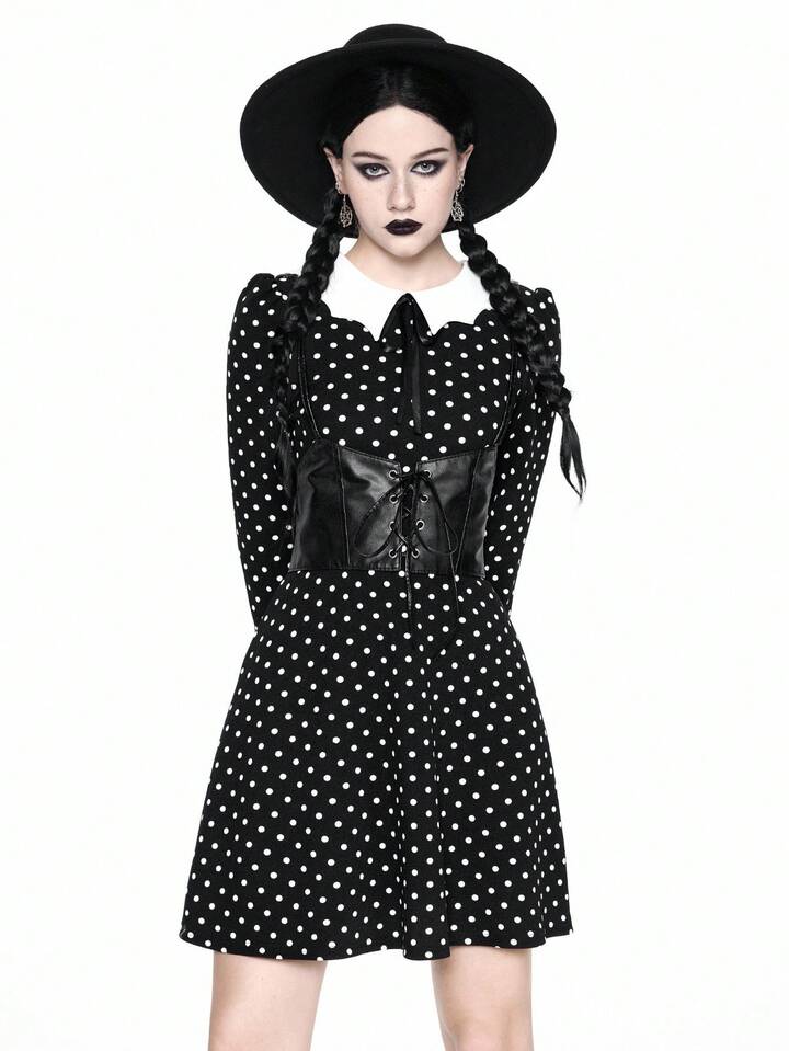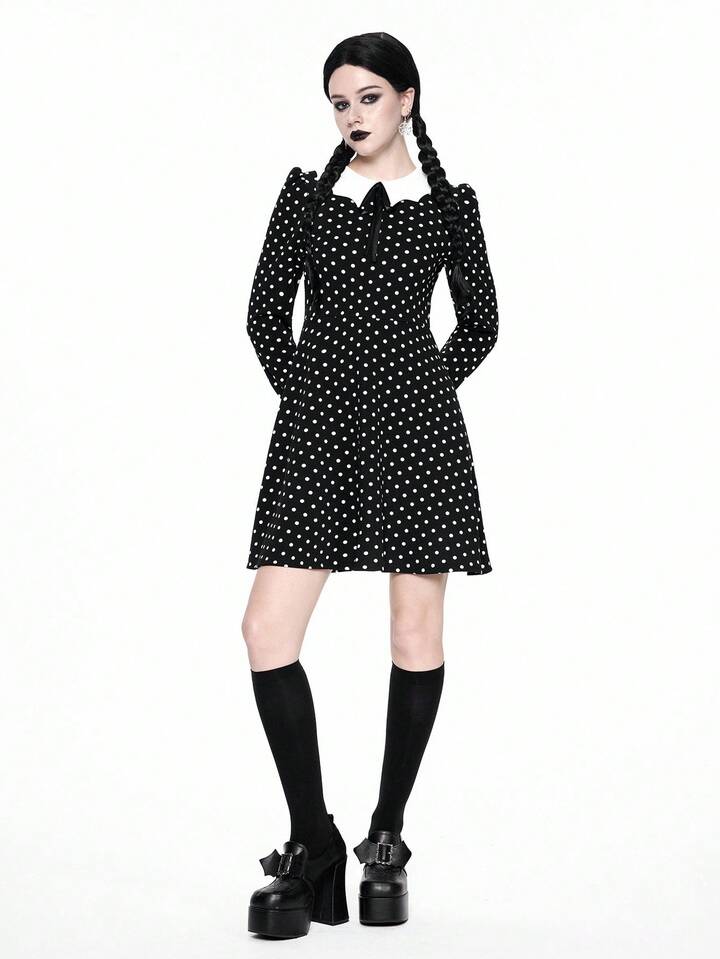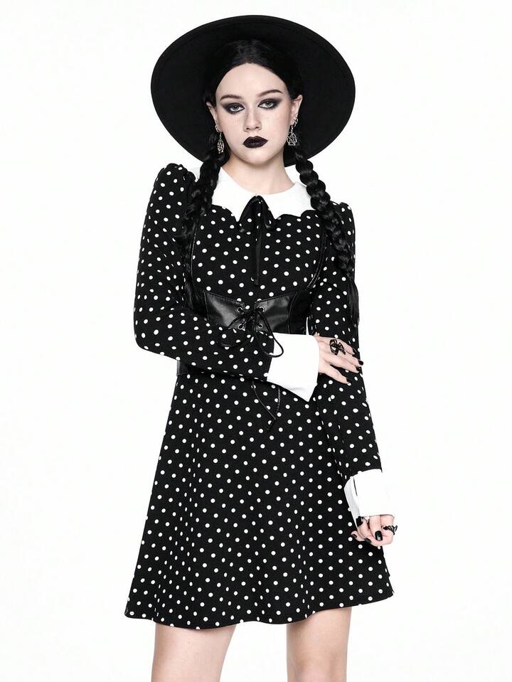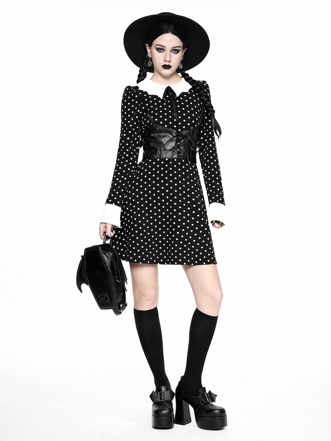 Women's Gothic Polka Dot Pattern Bat Collar Dress, Halloween