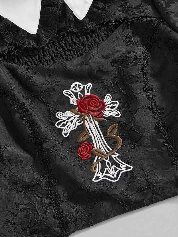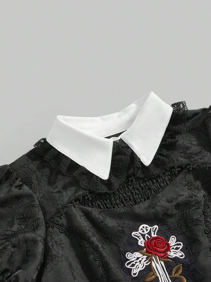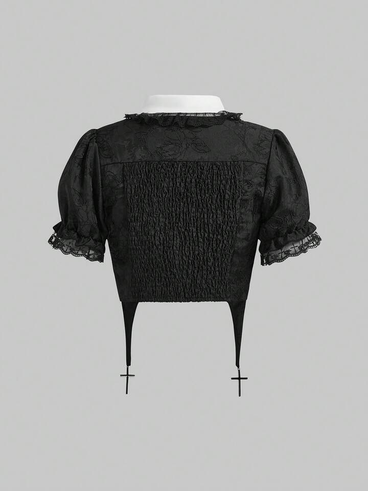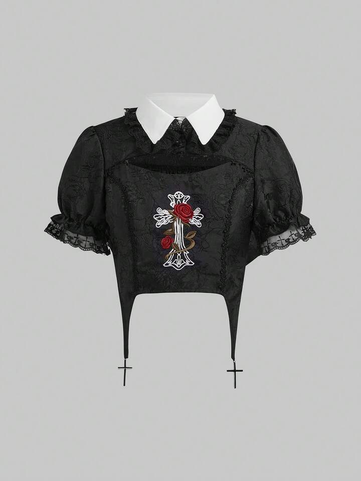 Women's Gothic Vintage Palace Rose Cross Embroidery Pendant Chain Puff Sleeve Blouse