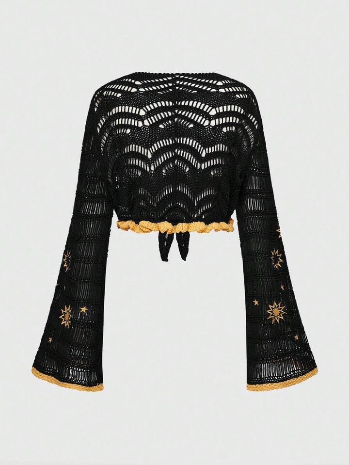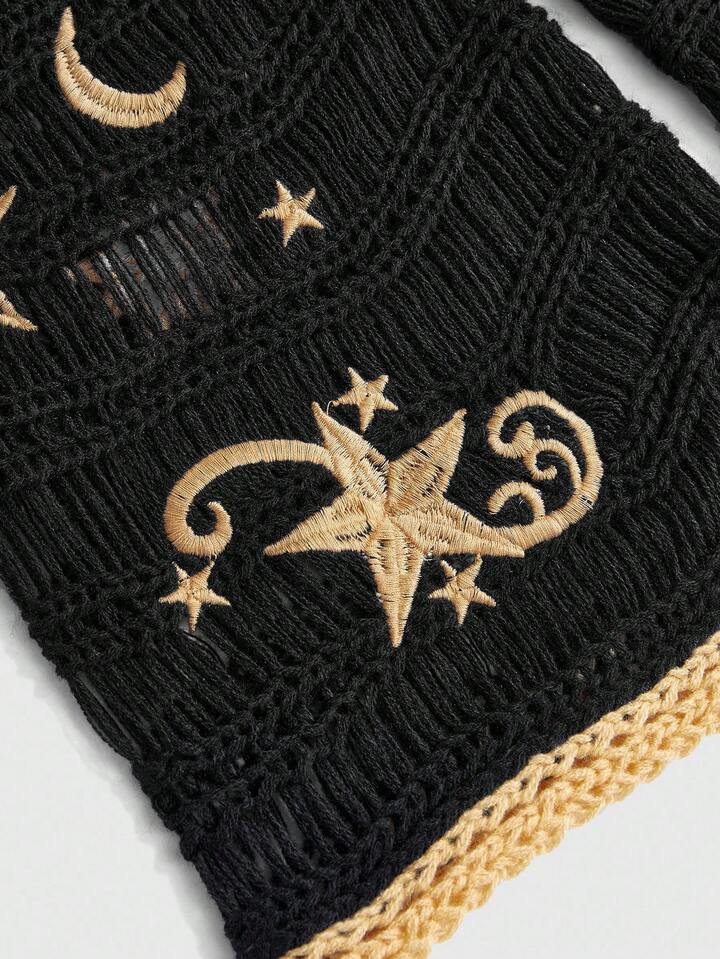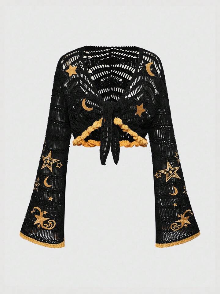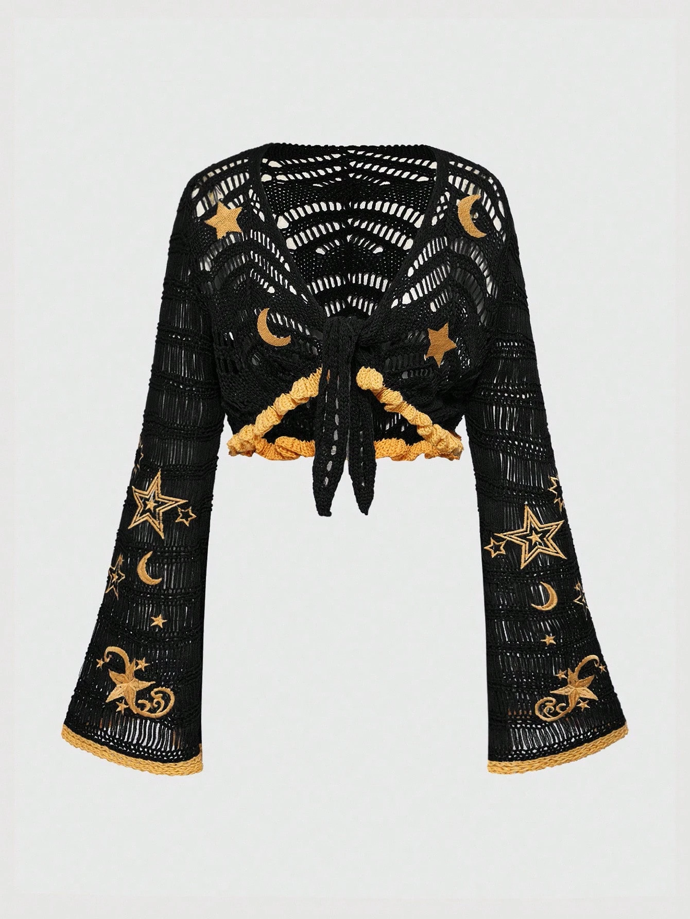 Women's Hippie Bohemian Style Moon & Star Embroidered Crochet Flare Sleeve Cardigan