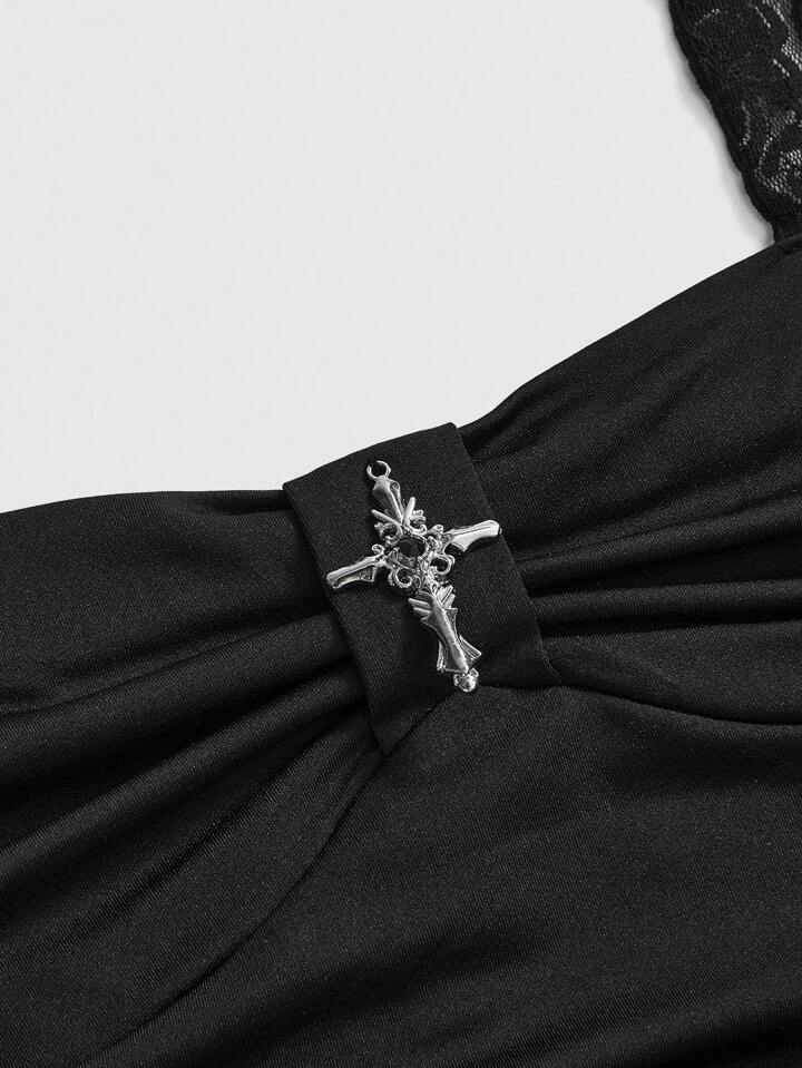Women's Lace Patchwork Asymmetrical Hem Lace Trim Halter Neck Tied Waist Tank Top