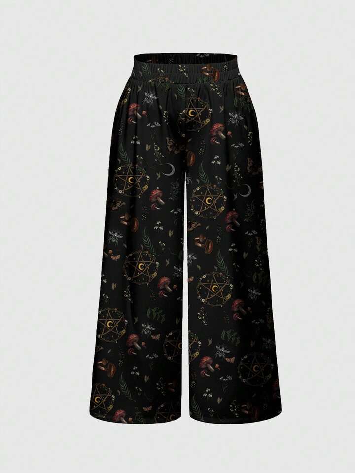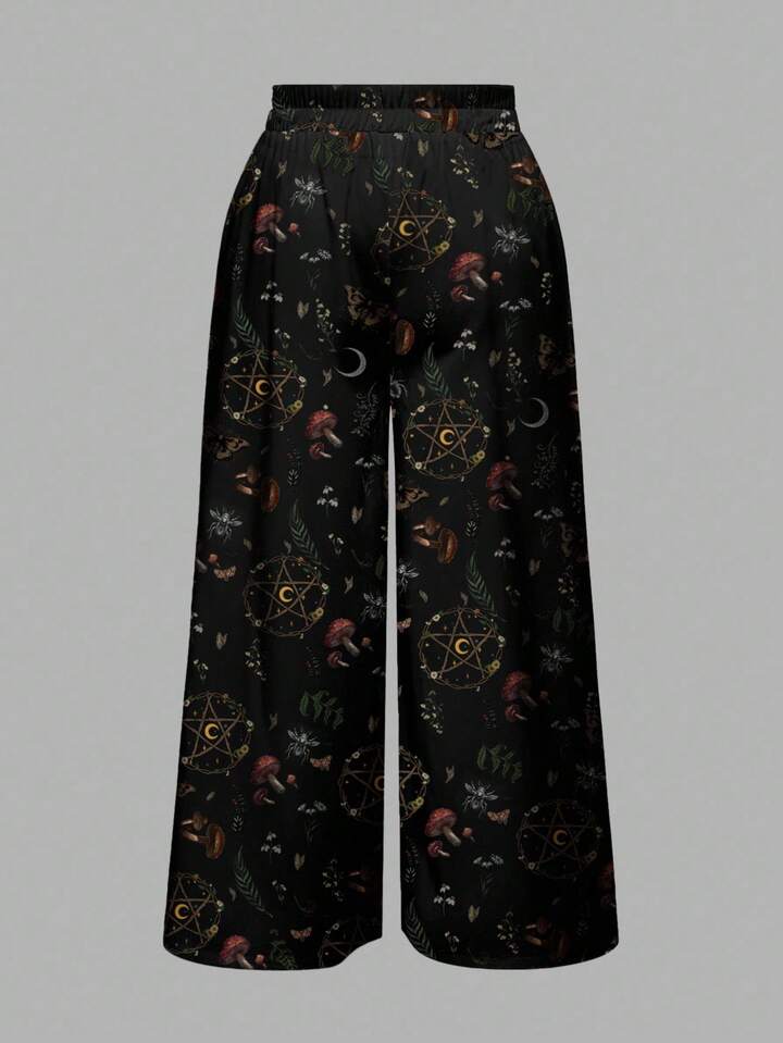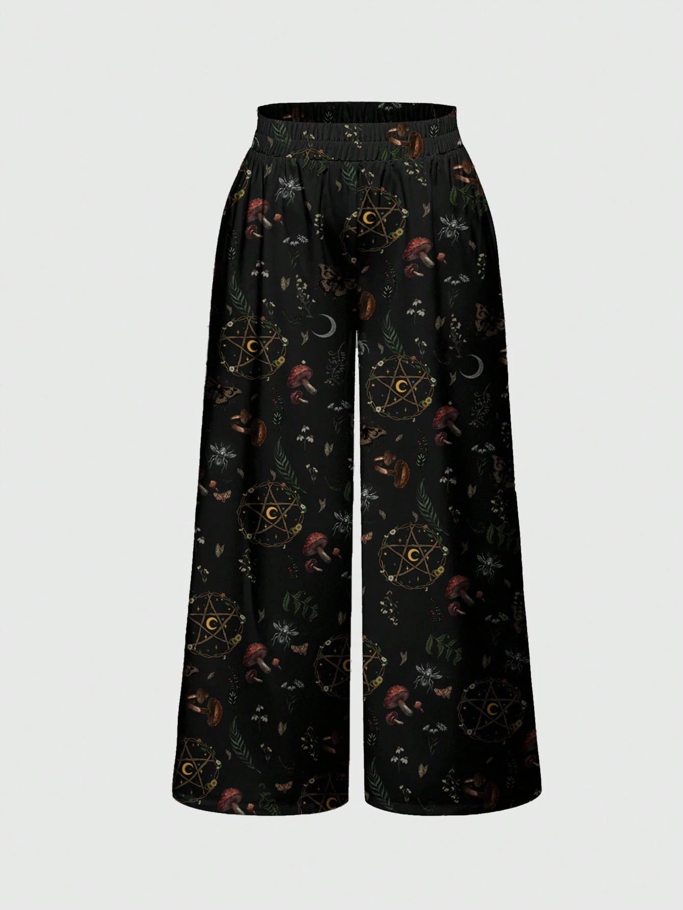 Women's Mysterious Gothic Dark Witch Botanical Moth Butterfly Leaf Star Moon All-Over Print Wide Leg Pants