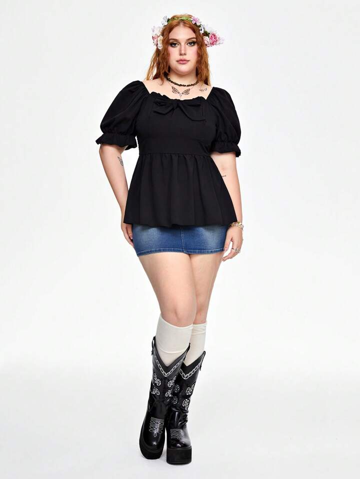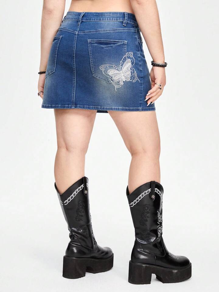 Women's Plus Size Butterfly Pattern Rhinestone Embellished Denim Skirt