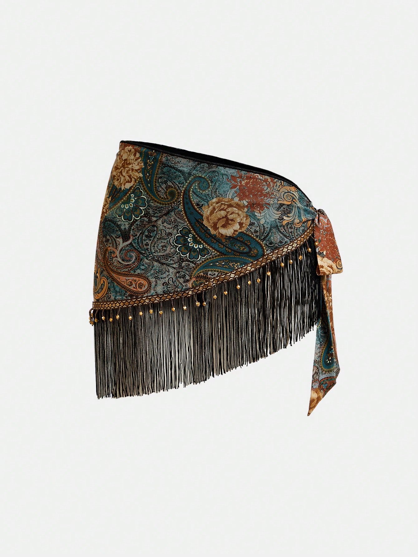 Women's Retro Hippie Western Music Festival See-Through Wooden Bead Decor Fringe Hem Paisley Print Tie Front Cover-Up Skirt