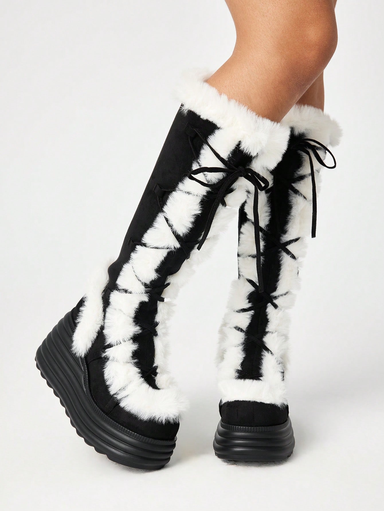 Women's Round Toe Punk Lace-Up Side Zipper Platform Thick Sole Fur Lined Knee-High Boots, Outdoor Fashion, Autumn/Winter New Arrival