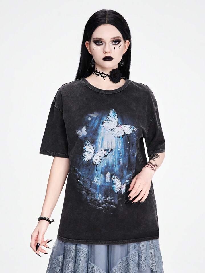 Women's Vampire Gothic Butterfly Atmosphere Loose Snowflake Washed And Distressed Print T-Shirt