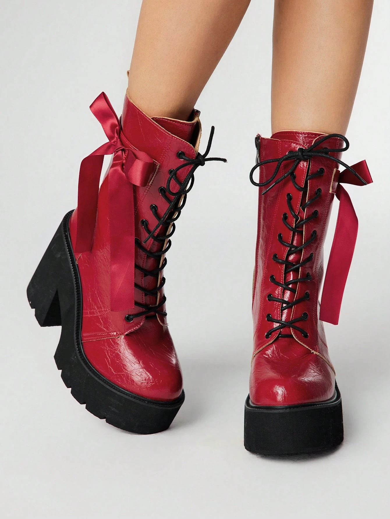 Women's Vintage Red Crinkle Leather Chunky Heel Mid-Calf Boots, Sexy Big Red Lace Bow Decor, Platform Waterproof Goth Punk Style Ankle Boots