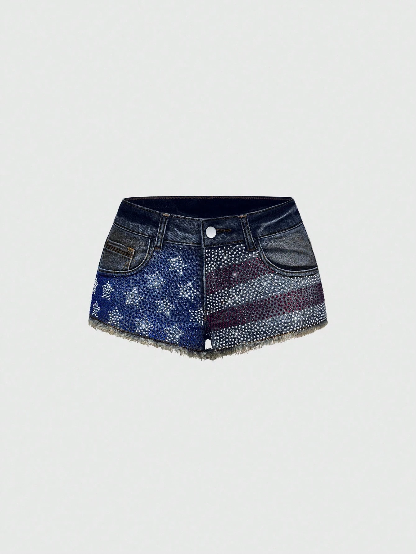 Grunge Punk Y2K Baddie 4th Of July Distressed Vintage Wash Ultra Low Rise Denim Shorts With Rhinestone American Flag