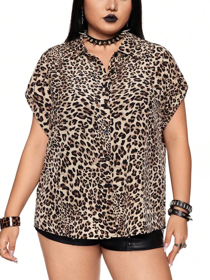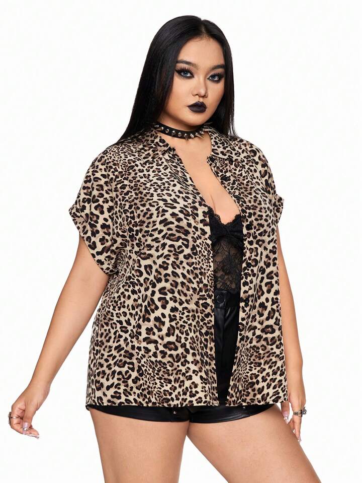 Y2K Cheetah Print Plus Size Open Front Shirt With Cuff Turnup, Plus Size