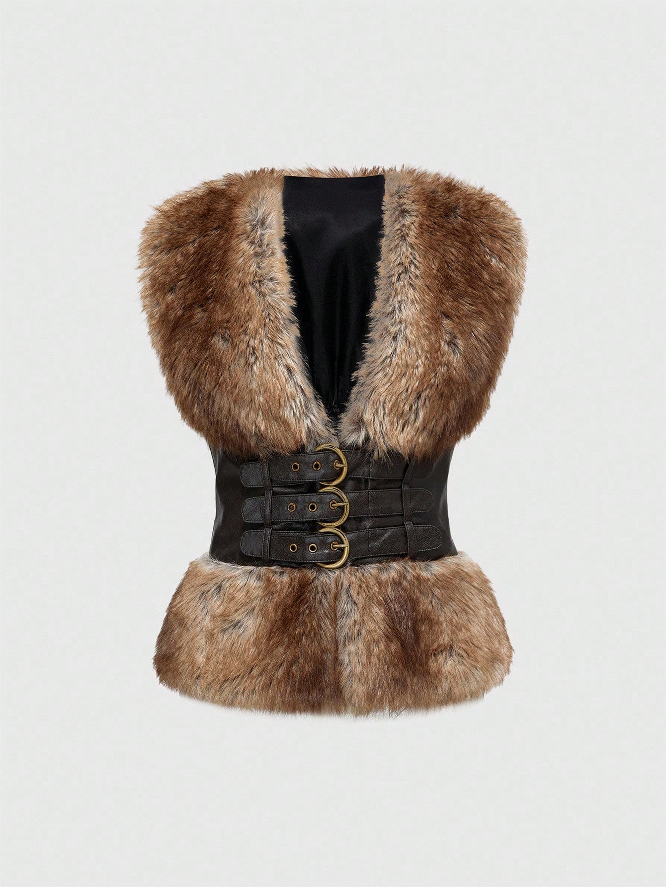 Grunge Punk Y2K Retro Colorful Faux Fur Patchwork PU Leather Vest Jacket For Women