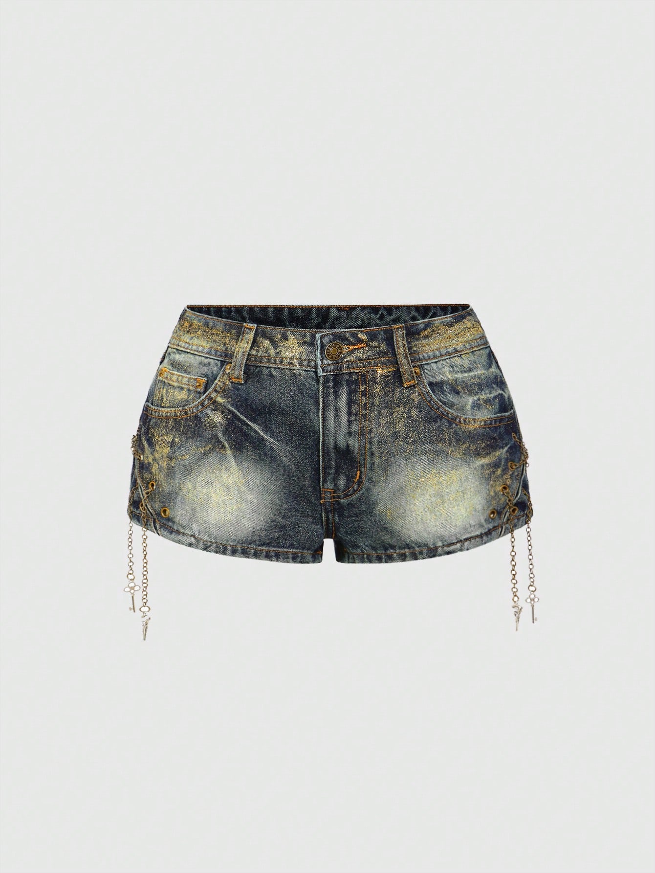 J-Fashion Y2K Shibuya Gyaru Millenium Retro Hot Girl Gold Foil Cross Vintage Low-Waist Skinny Super Low-Rise Women Denim Shorts