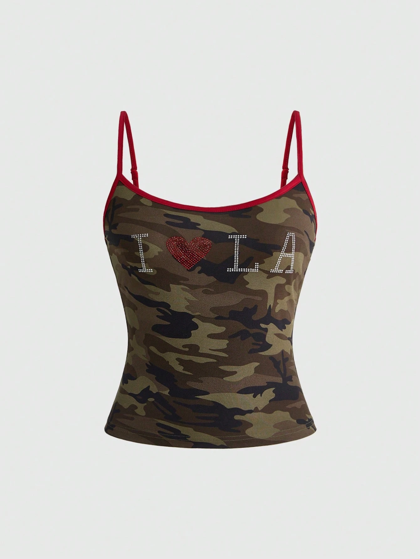 Y2K Spring/Summer Women's Casual Street Style Vintage Sexy Crop Top, Camouflage Pattern With Rhinestone Decor And Contrast Trim