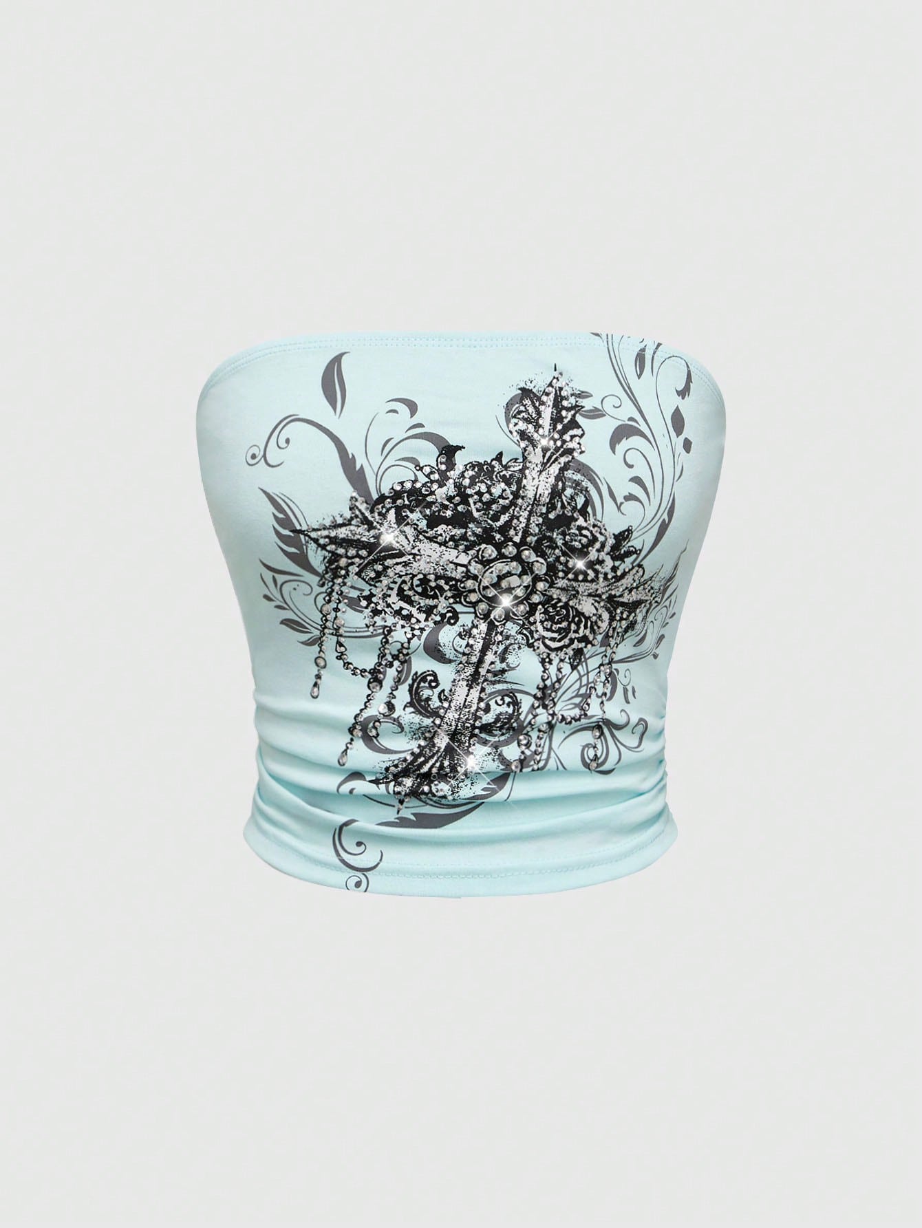 Y2K Style Cropped Graphic Tee With Rhinestone Accents For Women