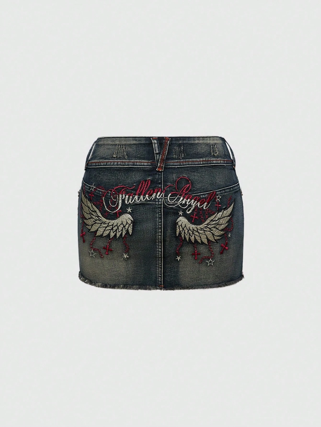 Hippie Y2K Style Wings And Cross Embroidered Retro Low Waist Denim Mini Skirt