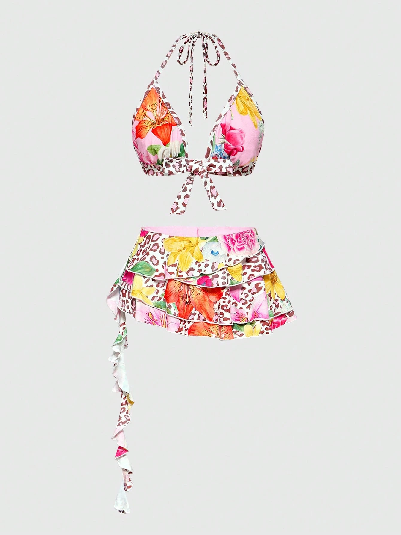 ROMWE Avant Y2K Tropical Vacation Leopard Floral Print Cheeky Bikini Top And Mini Low Waist 2 Pieces Swimsuit For Women