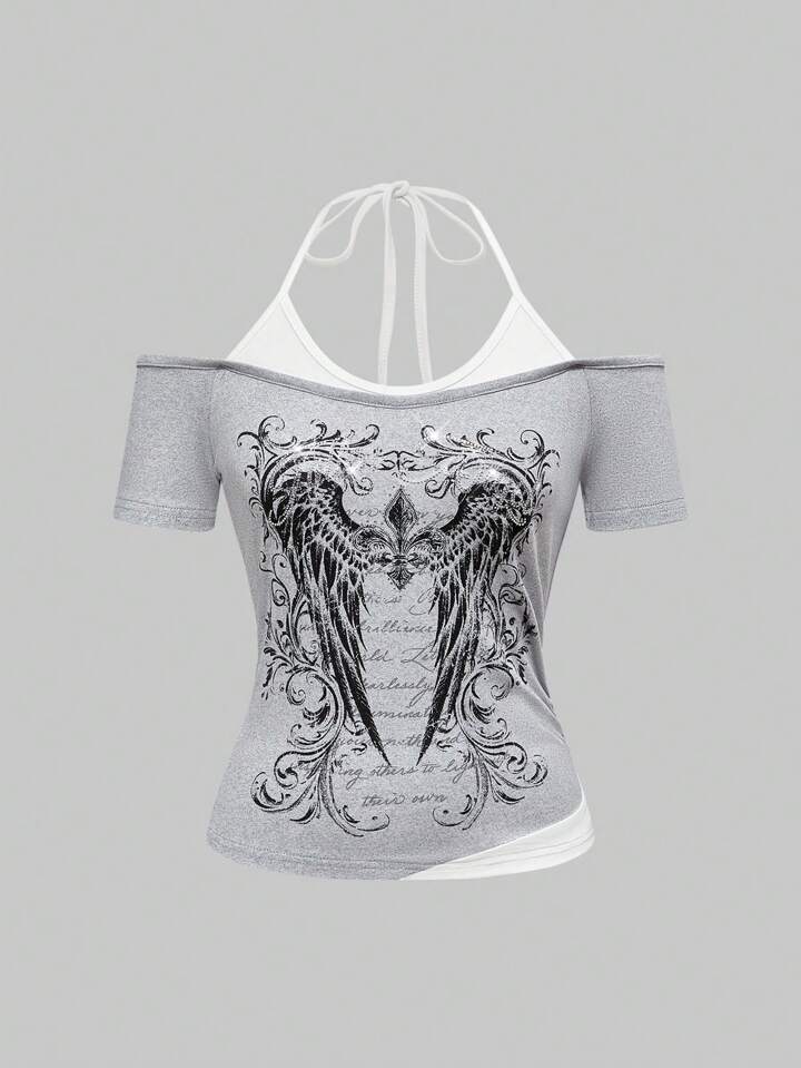 Y2K Vine Butterfly Wing Rhinestone Print Off Shoulder Halter Contrasting Panel Bodycon T-Shirt For Women