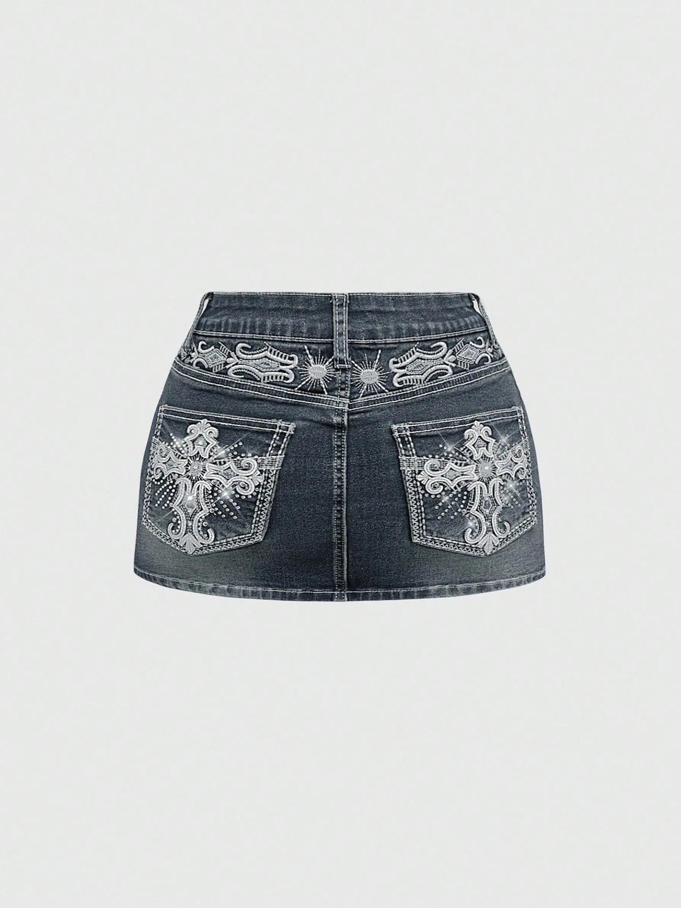 Grunge Punk Y2K Vintage Crop Top Corset Denim Mini Skirt With Pocket, Cross & Wing Embroidery, Plus Size