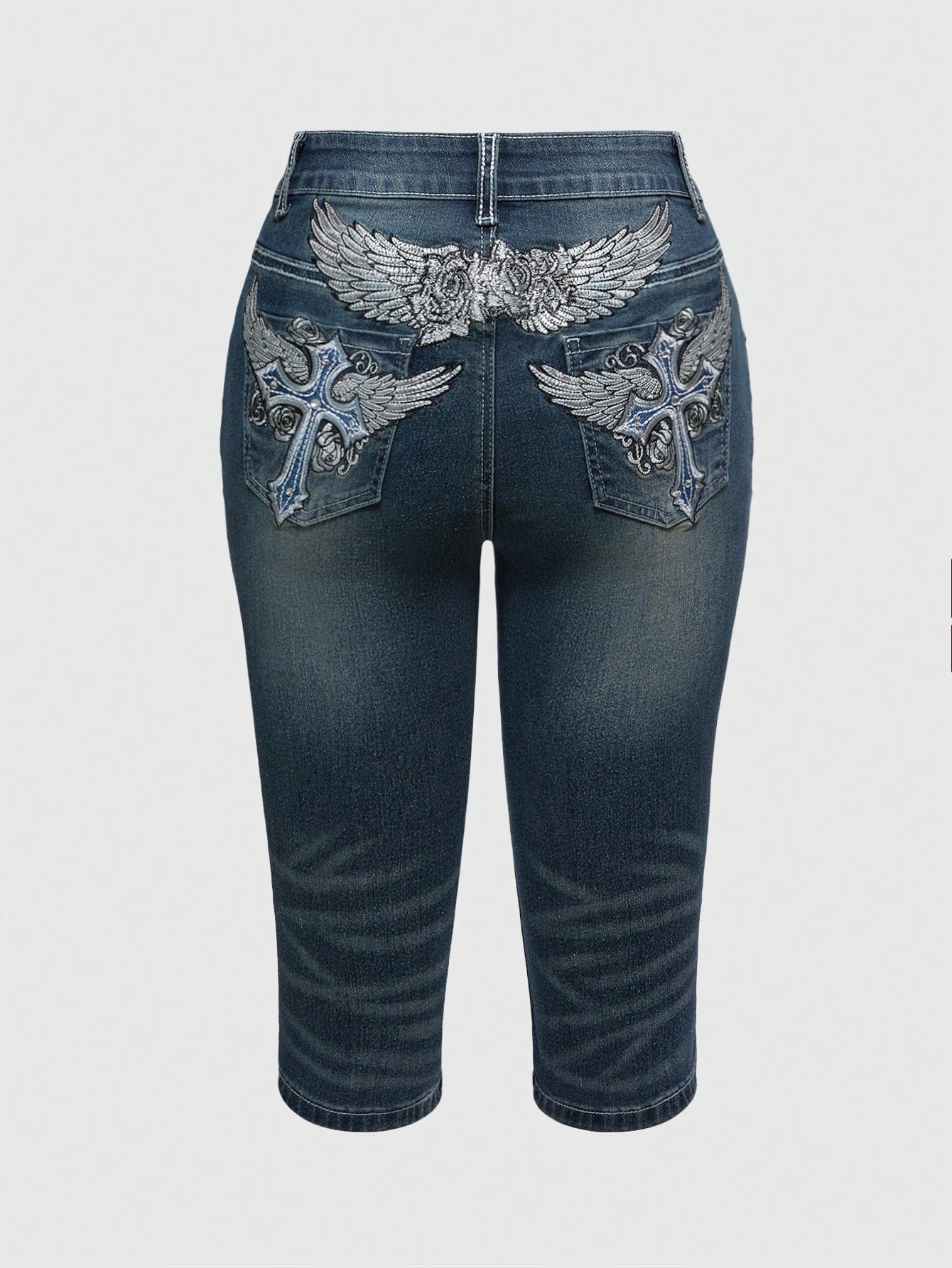 J-Fashion Y2K Vintage Midriff Exposed Cross Wing Embroidery Rhinestone Detail Fitted Flare 7/8 Length Jeans For Women