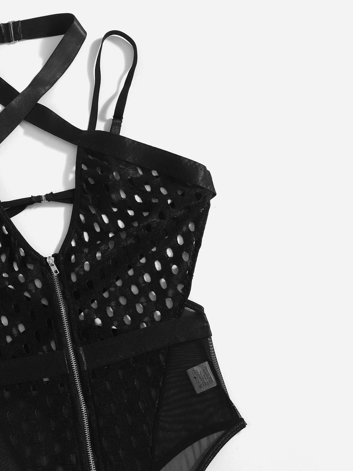 Zip Front Fishnet Sheer Teddy Bodysuit