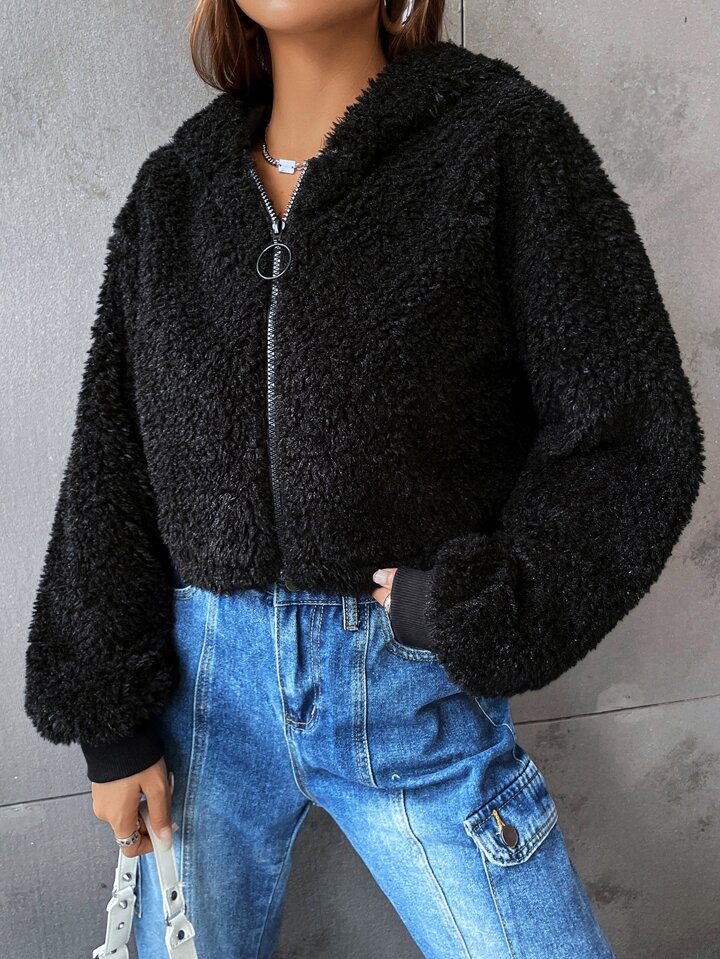 Zip Up 3D Ears Design Hooded Crop Teddy Jacket