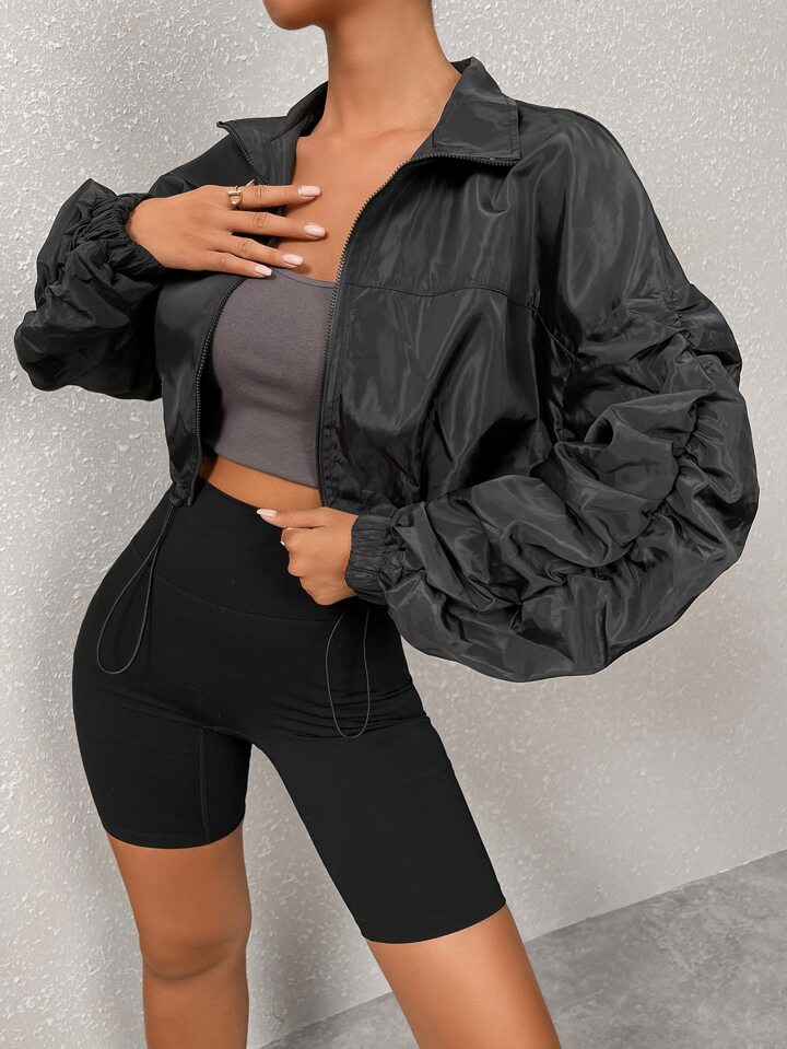 Zip Up Ruched Drop Shoulder Drawstring Crop Jacket