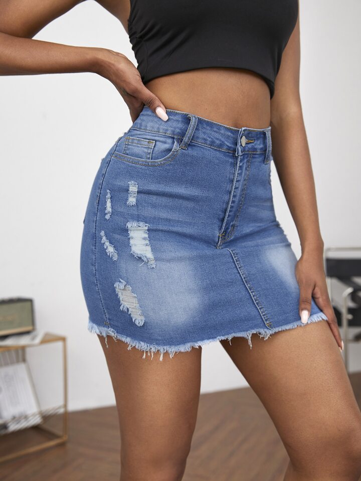Zipper Fly Ripped Detail Raw Hem Denim Skirt