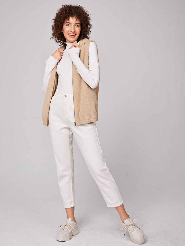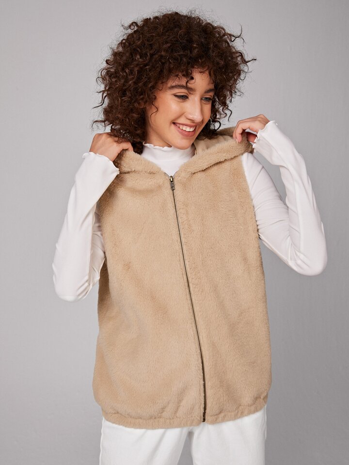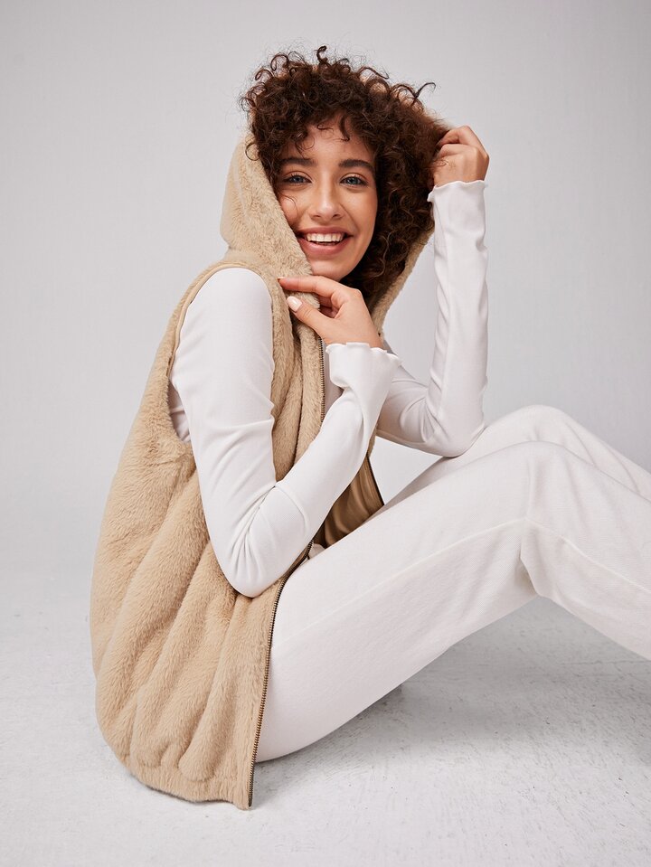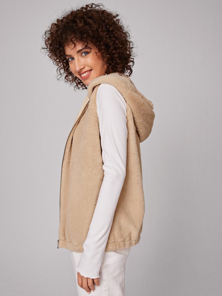 Zipper Hooded Teddy Vest Jacket