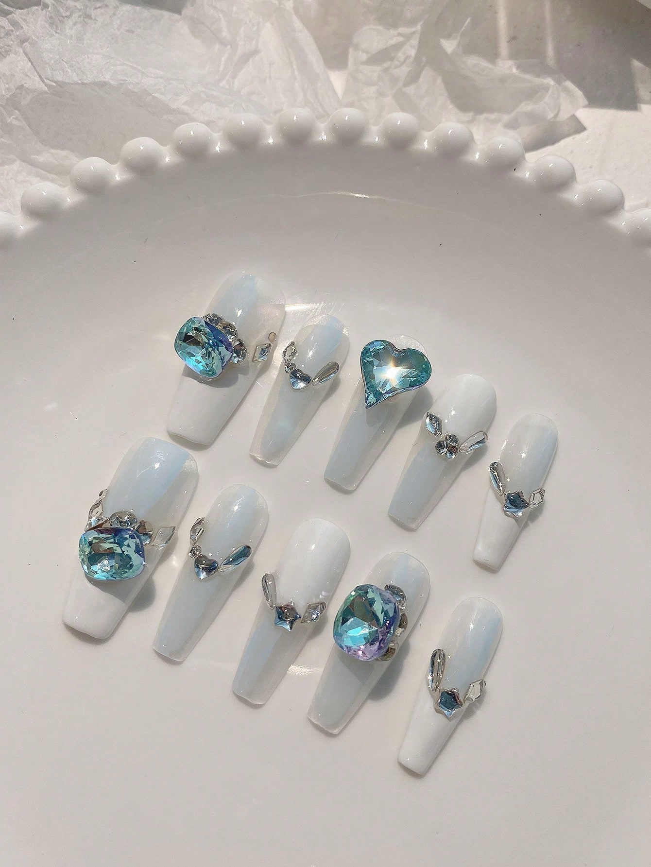 (in Stock) 10pcs/set Long-nail Misty Ocean Style False Nails With Jelly Glue